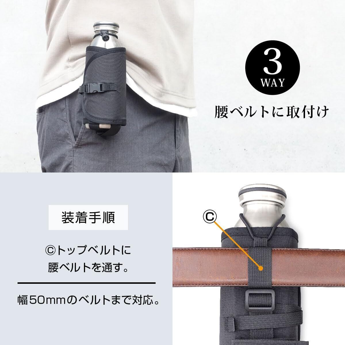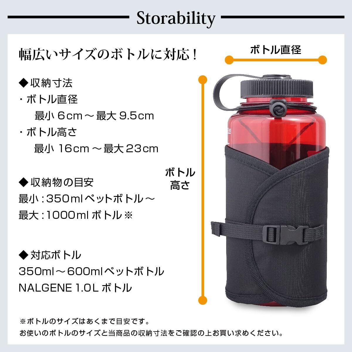 【対応ボトル】350ml~600mlペットボトル、NALGENE1.0Lボトル ※ボトルは付属しません。