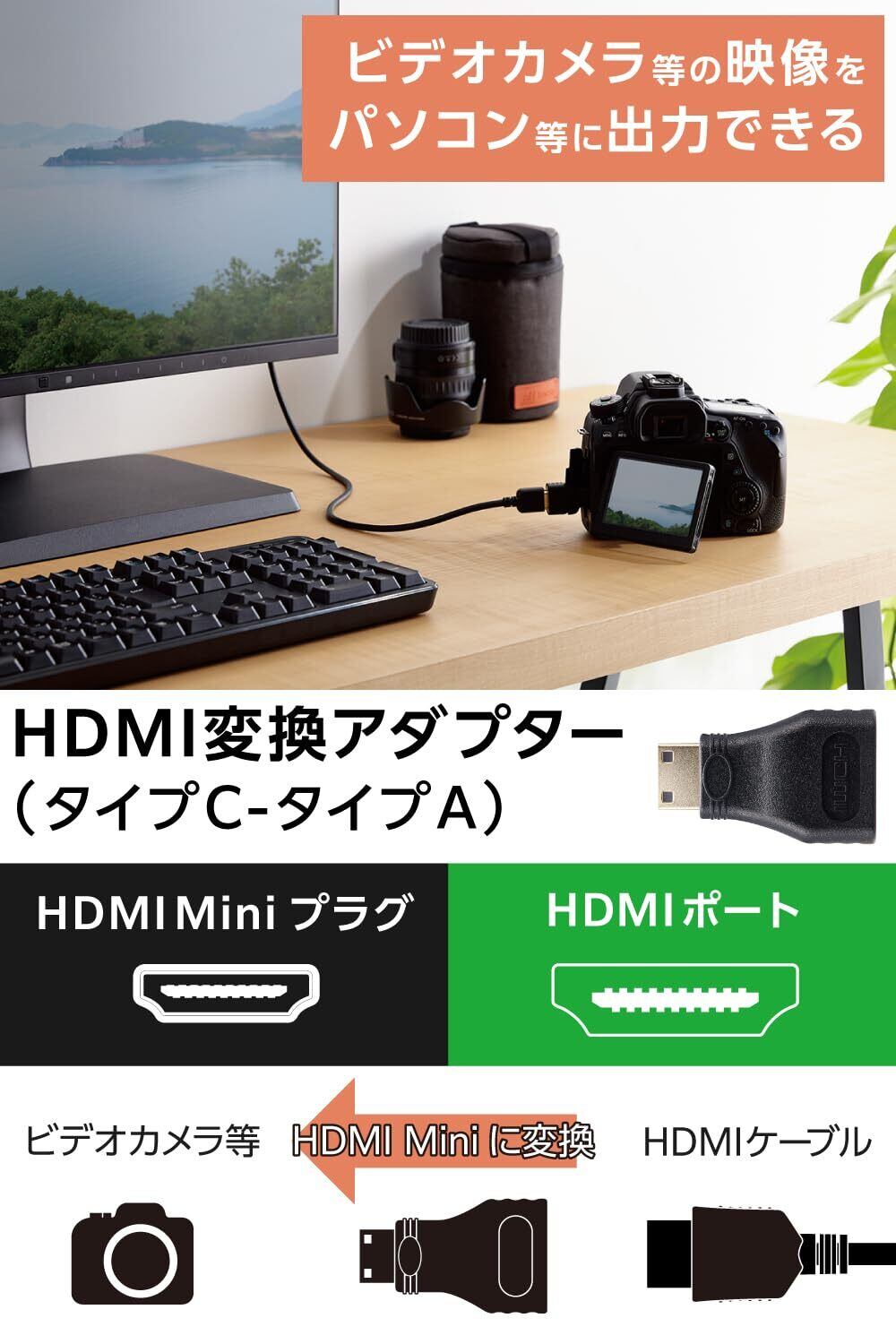 HDMIポート(タイプA)とHDMI Miniプラグ(タイプC)を変換し接続が可能です。