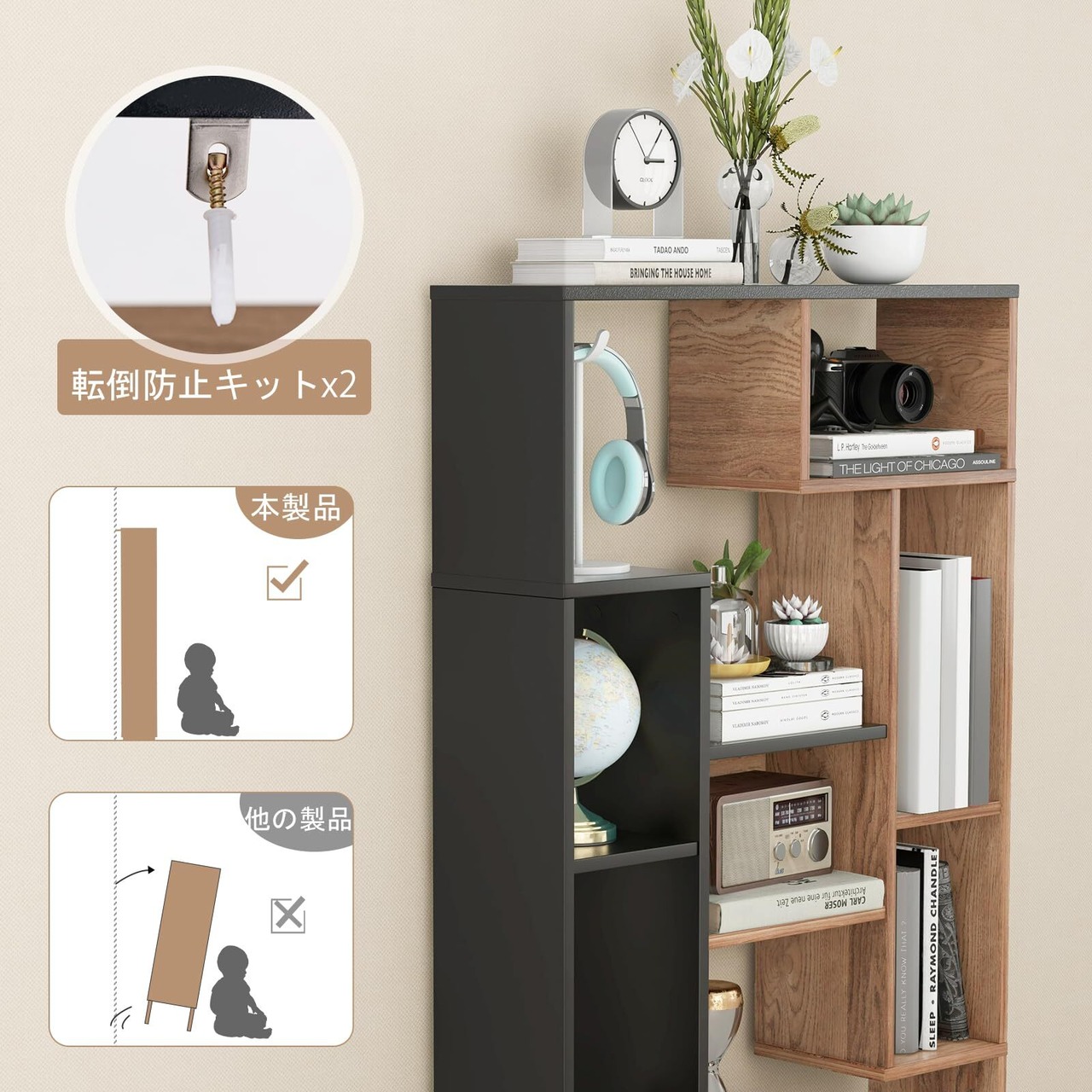 Giantex 本棚 コミックラック 幅70x奥行20x高さ120cm 耐荷重10kg/段 オープンシェルフ オープンラック 収納ラック ディスプレイラック 収納棚 飾り棚 植物ラック 文庫本収納ラック 絵本棚 雑誌 マンガ棚 リビングルーム ベッドルーム 書斎 転倒防止装置付き おしゃれ (ブラック+木目調) | hananoki