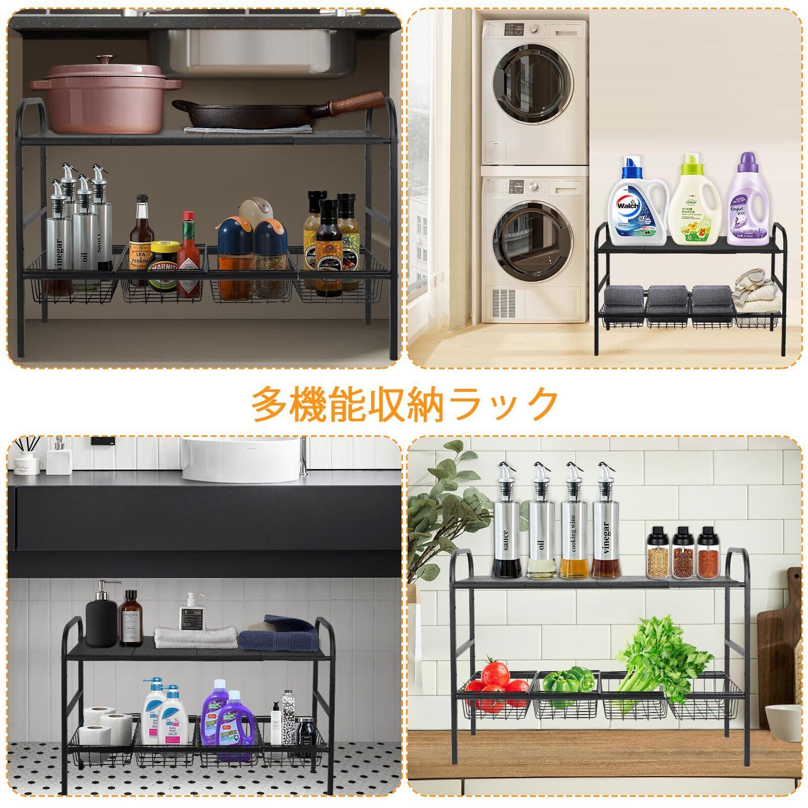 [シンク下収納ラック 洗面台下収納 伸縮式 2段収納 キッチン収納ラック 組み立て簡単 省スペース 収納バスケット4個付き W 53-88 x D 24.7 x H 48.5 cm]