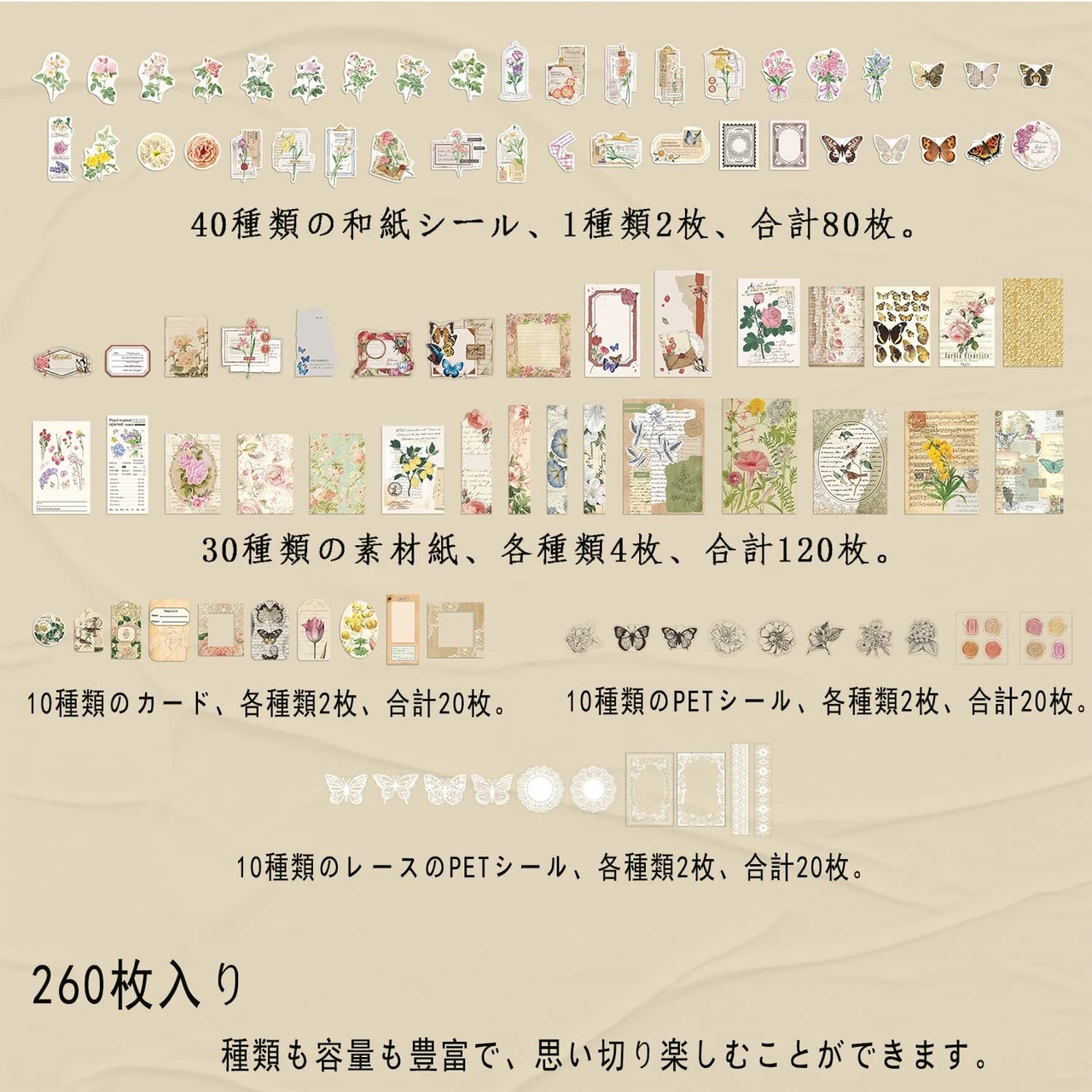「260枚の大容量」80枚の和紙シール(40絵柄*2)、 120枚の和紙素材紙(30絵柄*4)、20枚のグリーテカード(10絵柄*2)、20枚のPET透明ステッカー(10絵柄*2)、20枚の白いレースステッカー(10絵柄*2)、合計260枚の大容量で、思い切り使うことができます。