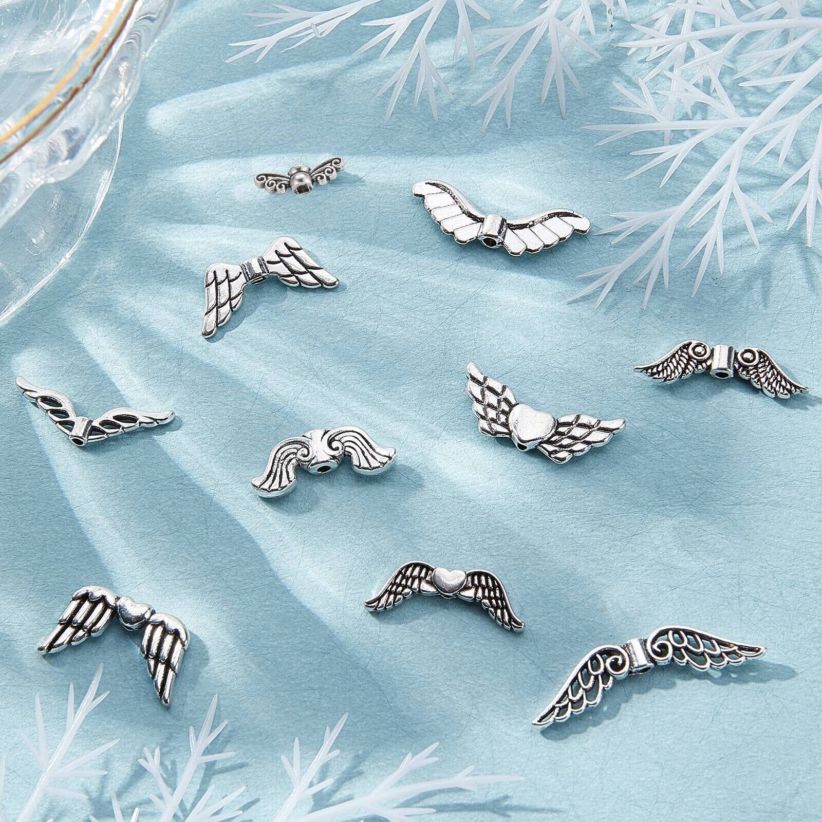 SUNNYCLUE 100個10種 合金 ビーズ チャーム 羽 スペーサー ビーズ 天使の羽 スペーサービーズ 翼柄 デコ パーツ 翼 チャーム チベット 翼の形 ビーズ チベット 合金 チャーム ルーススペーサービーズ アンティーク シルバー 銀古美 ジュエリー用 アクセサリーパーツ 手作り素材 材料 シルバー デコ パーツ エンジェルウイング アクセサリーパーツ ウィング 合金 DIYクラフト作り ネックレス ブレスレット イヤリング クラフト ジュエリー作成用