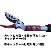 ◎キャッチャー:カットした葉、小枝を落とさないキャッチ機構 切断した葉や小枝をしっかりキャッチ。 そのまま落とさずに下ろすことが出来ます。 キャッチする必要がない時はキャッチャーを取り外すこともできます。