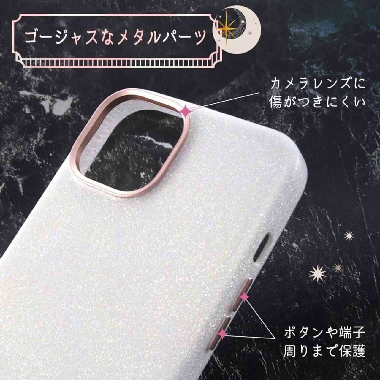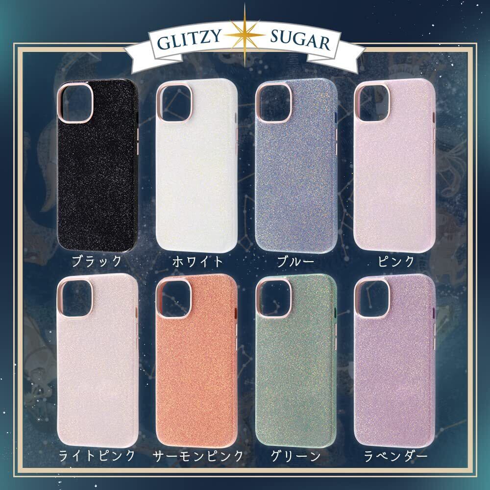特殊なラメ加工を施したキラキラと綺麗な素材感のケース。サイドボタンやカメラ周りなど統一感のあるメタリックパーツ。内側はやさしく端末を守るマイクロファイバー素材。ラメ塗装ですが表面はツルっとした仕上がりです。メタリックカラーの上に大小ランダムに数色のラメを取り入れてみる角度によって色味、煌めき具合が変わりキラキラと華やかに演出してくれます。
