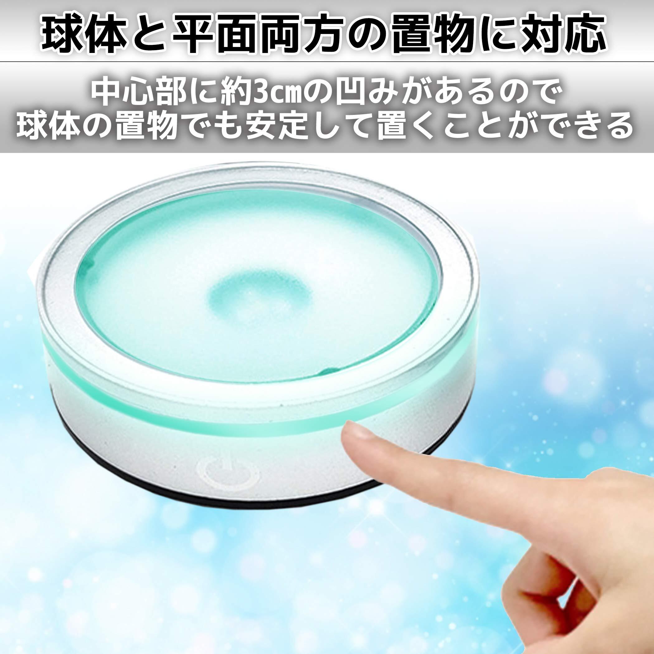 カラフルに発色:ライトはボタンを押す度に青、白、紫、緑、黄色、赤、ピンクの7色に変化します。自動で色が切り替わるモードもあります。台座の中心部に直径約3cmの凹部があるので球体も置けます。設置面が平面のものを置くのにも活用しやすいでしょう。