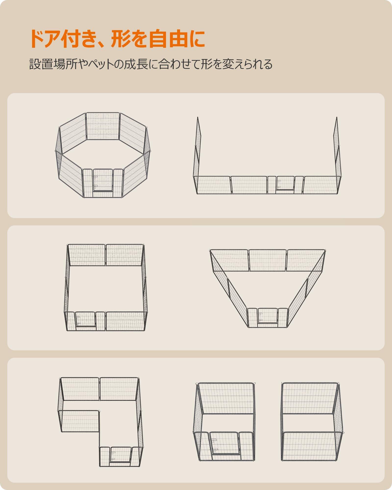 【カタチはアイデア次第】スペースに合わせて8つのパネルを活かして、長方型、正方型、八角型、L字型などに変更できます。ペットに窮屈な思いをさせる事なく、日常のトイレ訓練やハウストレーニングに便利なペットサークルです。サイズ:長方型:幅231x奥行77x高さ120cm、正方型:154x154x高さ120cm、八角型:直径210cmx高さ120cm