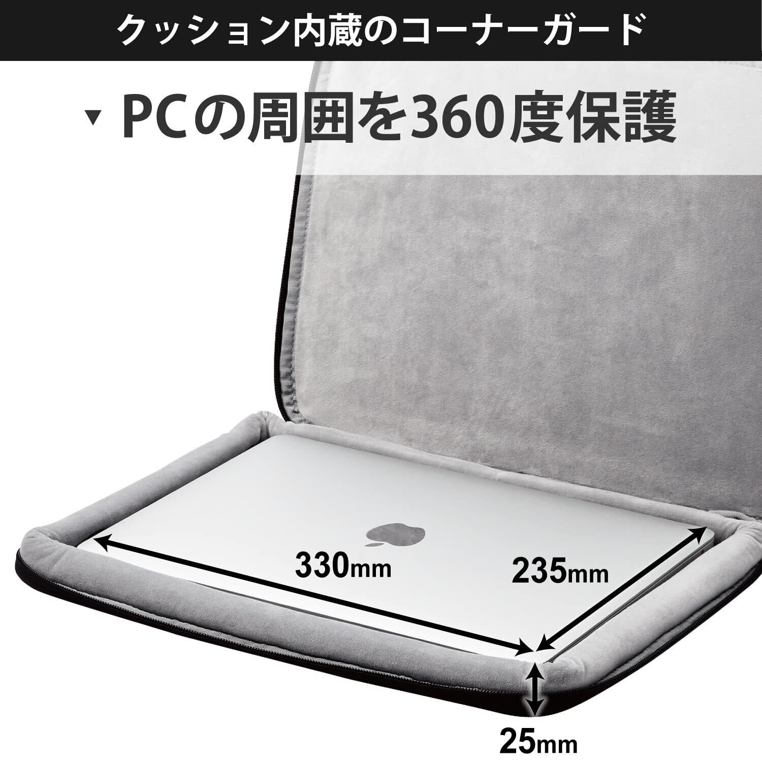 側面を360度保護するコーナーガードクッションと、天面、底面それぞれに内蔵された低反発ウレタンフォーム、機器表面を傷つけない内側の優しい起毛生地によって、収納物を徹底的に保護します。撥水加工を施した落ち着いた風合いの生地を採用したシンプルなデザイン。保護性能とスリムを両立させたインナーケースです。