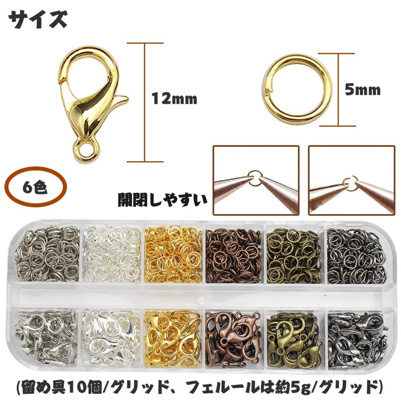 サイズ:ロブスタークラスプ:幅約7mm、長さ12mm、厚さ3mm、口径1mm。アイアンリング:5x0.6mm ボックスサイズ: 13x5x1.5cm (留め具10個/グリッド、フェルールは約5g/グリッド)