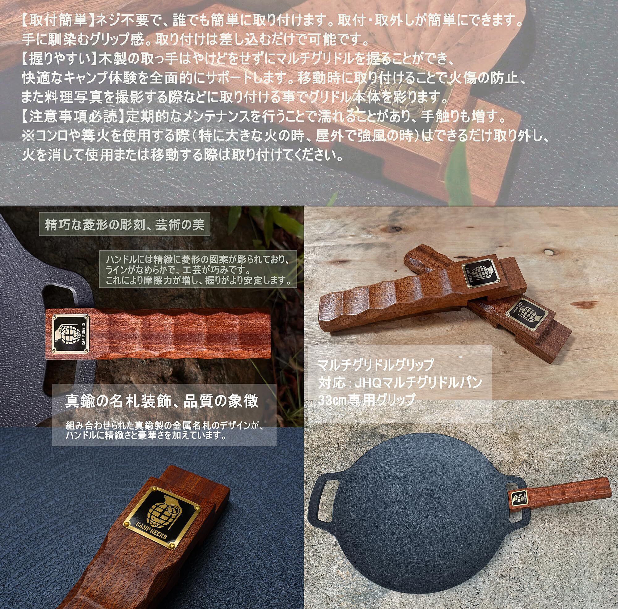 マルチグリドル 取っ手カバー 33cm対応 グリップ木製 鉄板取っ手 真鍮金属の名札デザイン マルチグリドル用のハンドルウッドカバー 火傷防止 取付簡単