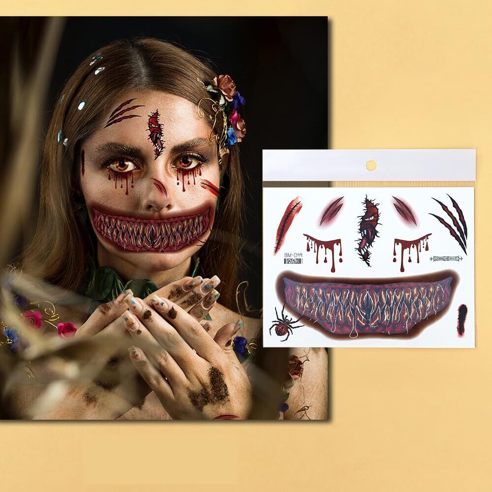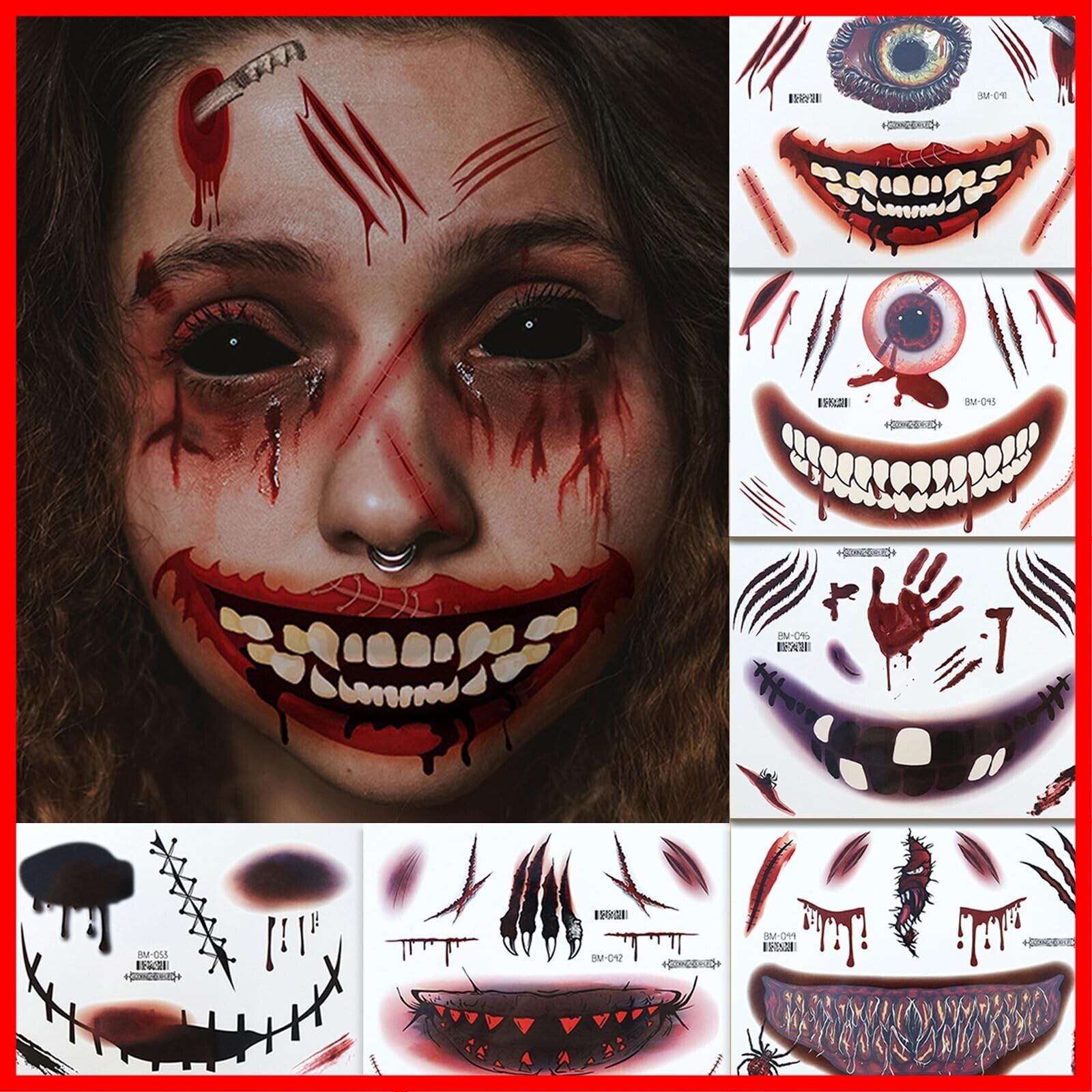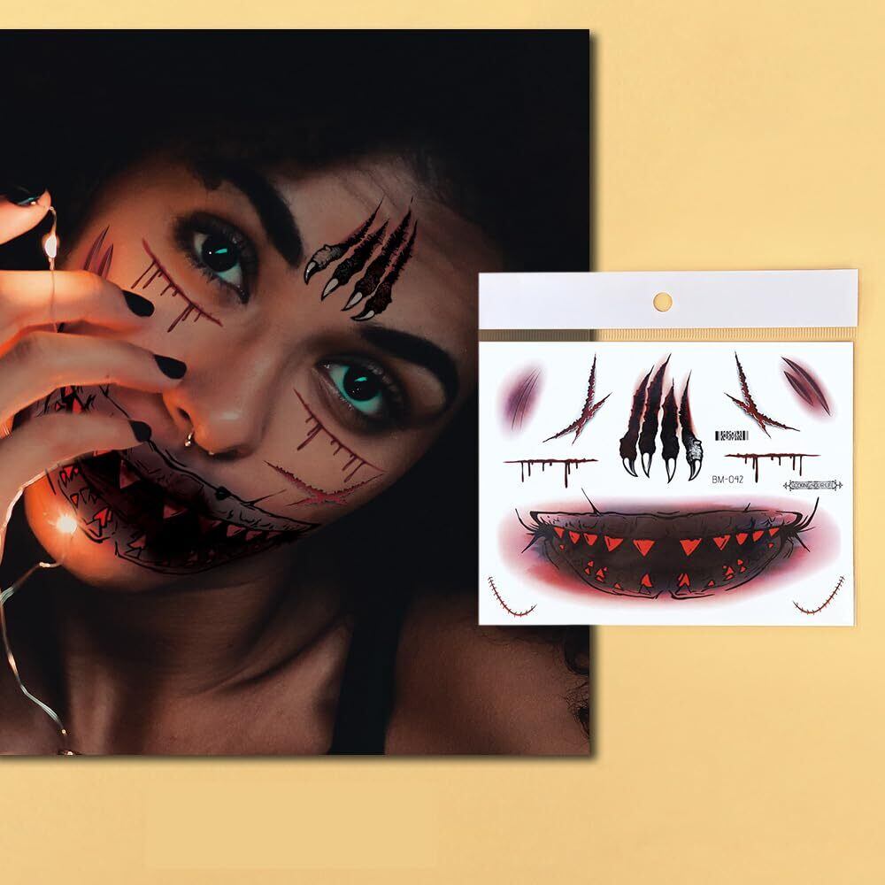 FINGOOO ハロウィン タトゥーシール フェイス 顔全体 6枚セット 刺青 テッカー シール かわいい 傷 小物 仮装 メイク 縫い傷 爪裂き 傷跡 (A)