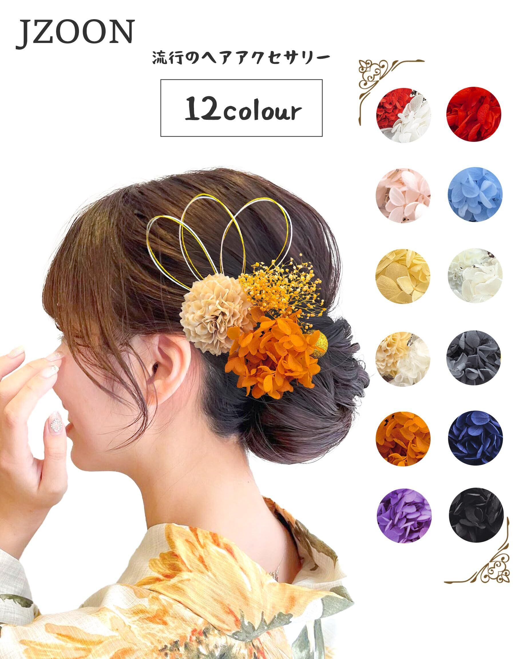 全12色 浴衣 髪飾り 成人式 袴 卒業式 和服 和装 着物 ドライフラワー ピンポンママ 紫陽花 かすみ草 金色の玉 水引 赤 白 青 オレンジ B7001