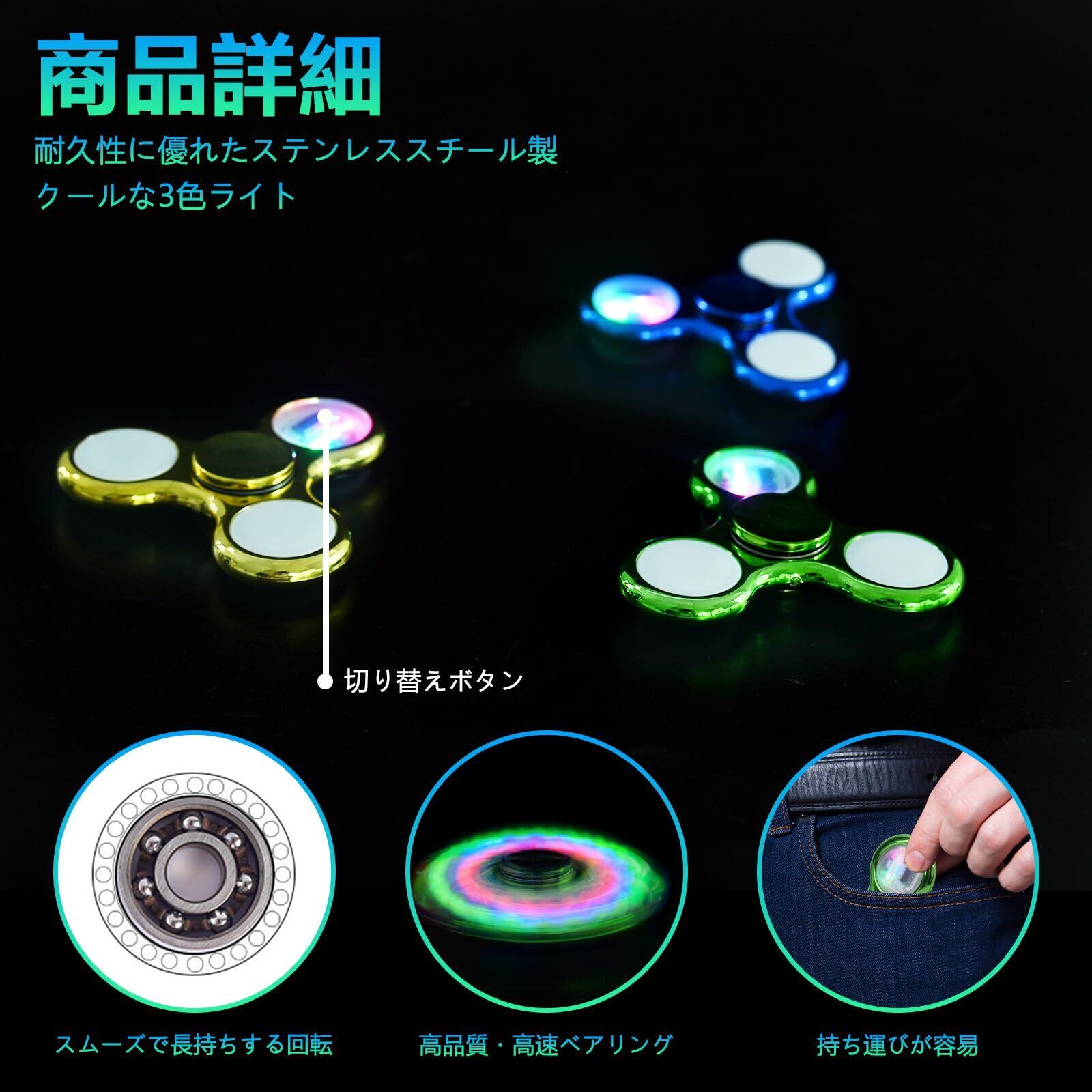 【実用的で楽しい指ジャイロ】電池は交換可能でハンドスピナー 光る 、透明カバーを軽くこじ開けるだけで簡単に交換できる。子供/大人、ADHD、不安、集中、自閉症のための素晴らしいfidgetおもちゃ。子供の教室のための家族の教育おもちゃそして賞品箱。オフィス、ワークスペース、学校、大学、家庭、さらには地元の通勤や旅行のためのスマートな選択。
