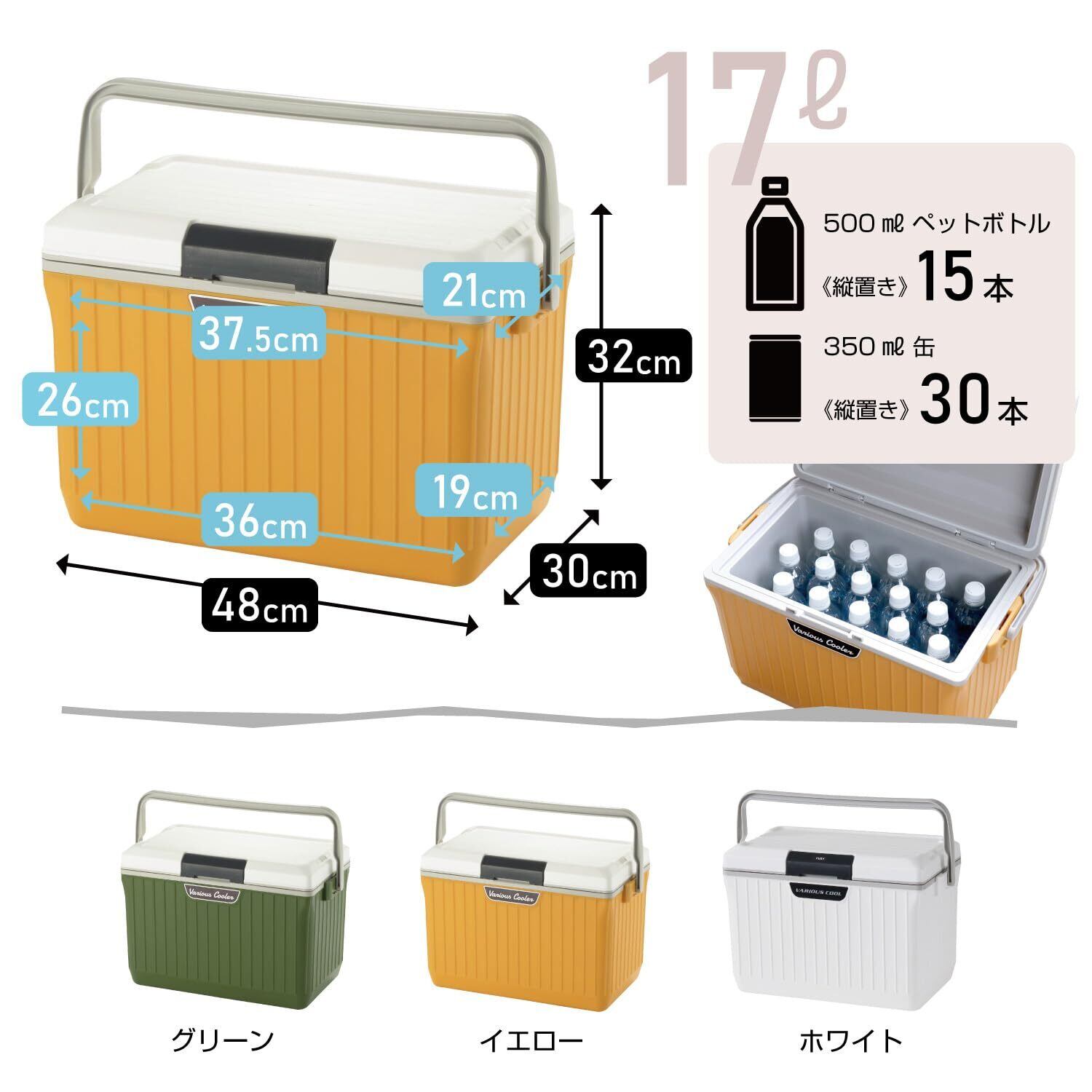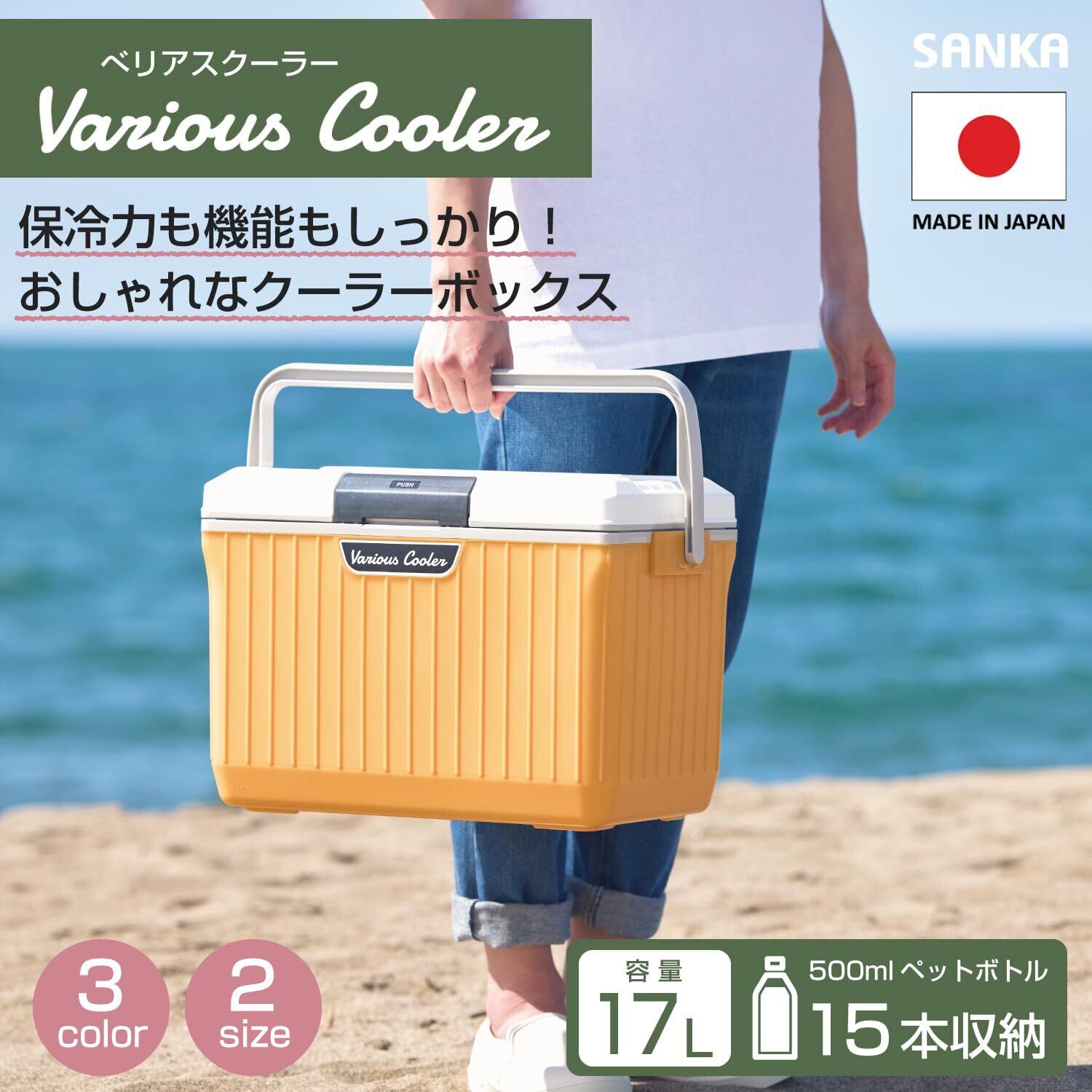 サンカ べリアスクーラー 高性能な断熱材を採用 ワンプッシュオープン型クーラーボックス 17L 大型 イエロー 保冷力の高いハードタイプ 蓋が外せてお手入れ簡単 作業台にもなるフラットなふた 2人で持ち運べる大きな持ち手 ショルダーベルト付き 釣り キャンプ アウトドア レジャー BBQ cooler box 冷藏箱 日本製 SANKA VAC-17WH/YE