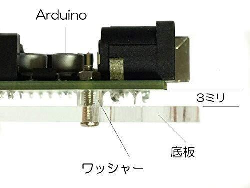 Arduinoの基板は、金属ビスとナット、透明な3ミリ厚のワッシャー4組を使い底板に確実に固定できます。