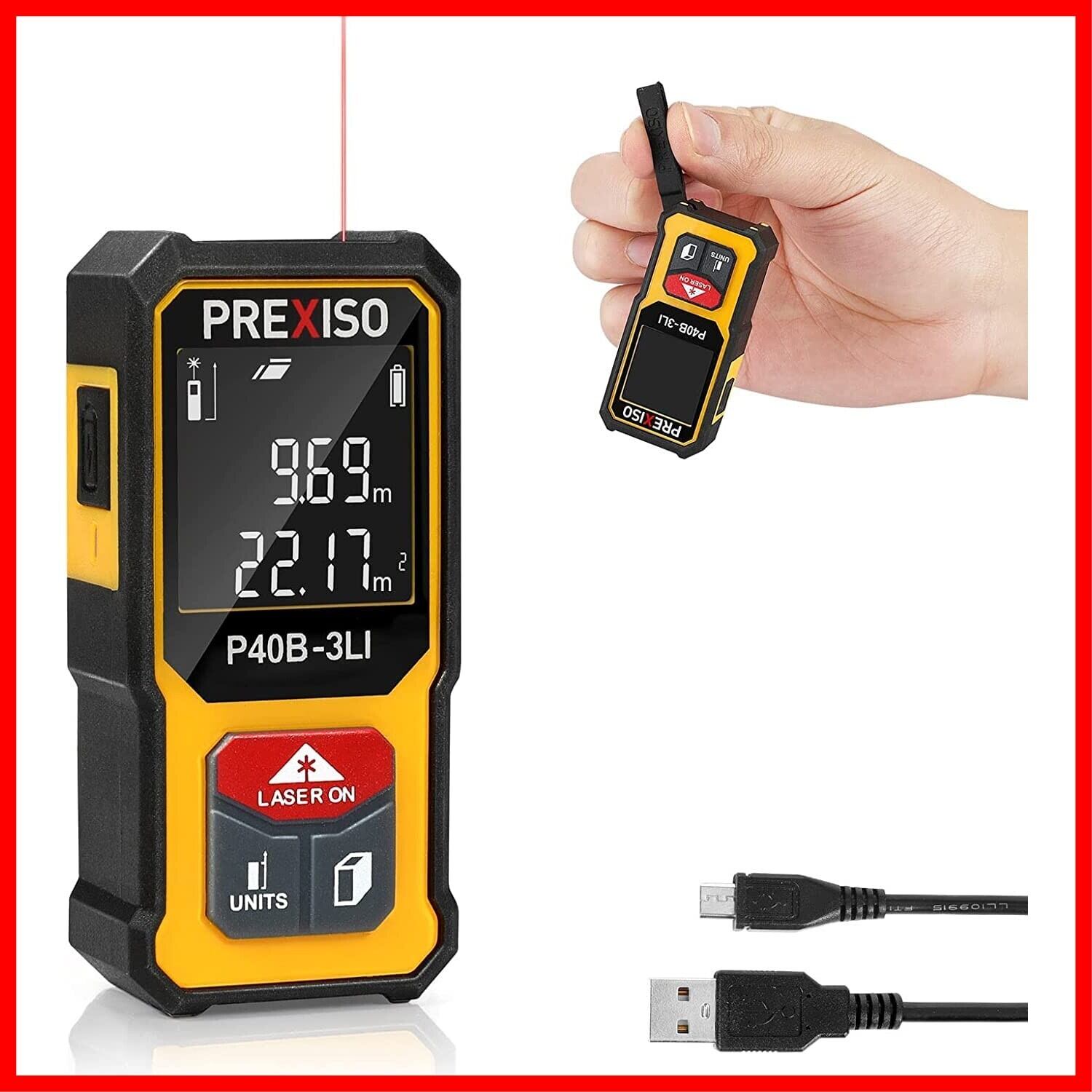 PREXISO レーザー距離計 電子距離計 距離測定計 ミニ 40M PSC認定取得 コンパクト 高精度 USB充電式 6種測定モード 距離 面積 体積 ピタゴラス測定 連続測定 自動計算 操作簡単 日曜大工 家庭 建設現場 土木現場の室内測定 イェロー