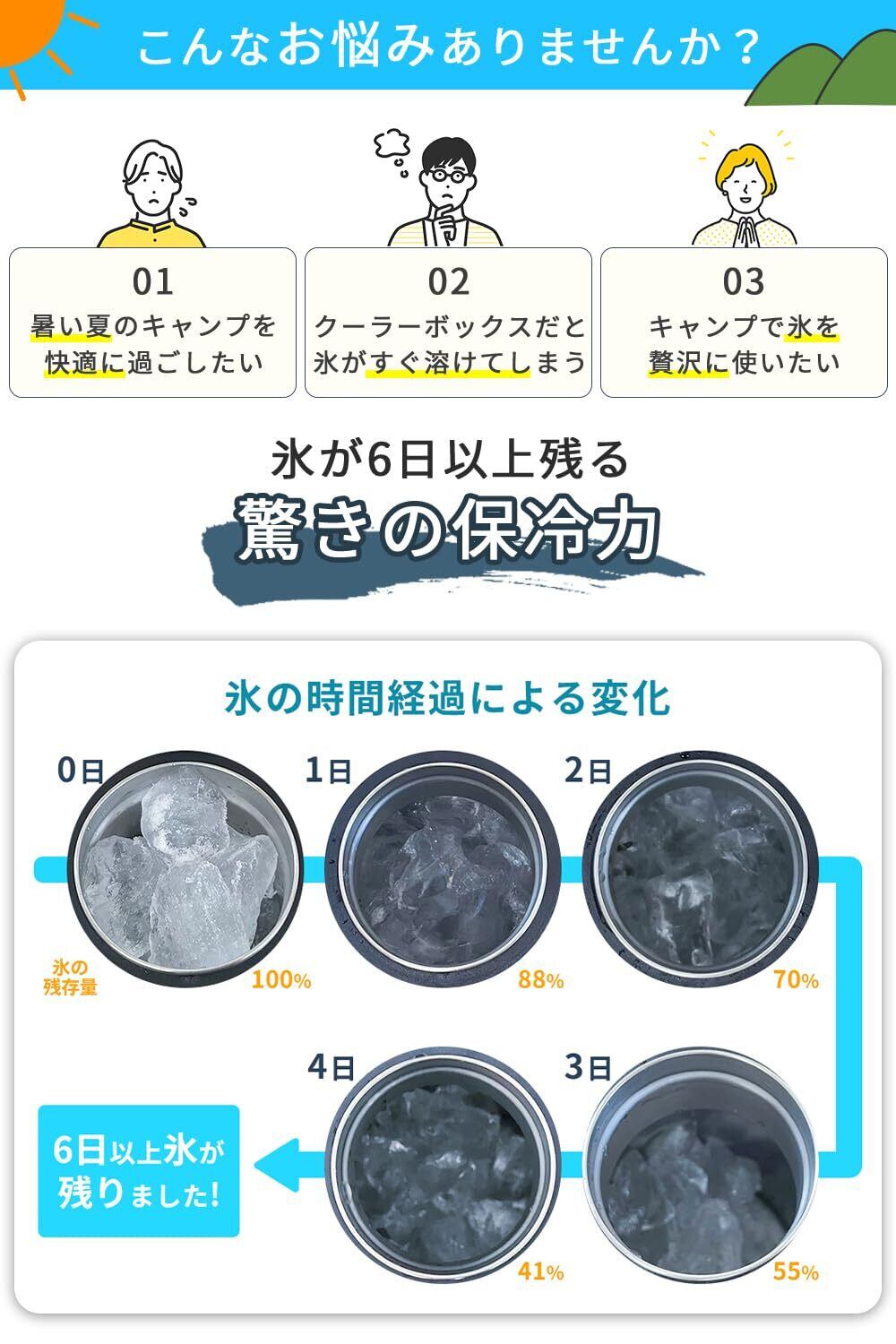 【驚きの保冷力】12時間毎に氷が全て溶けきるまでの経過を観察し、6日以上氷が残ったことを確認しました。(直射日光の当たらない、室温24℃±2℃の環境で実験)