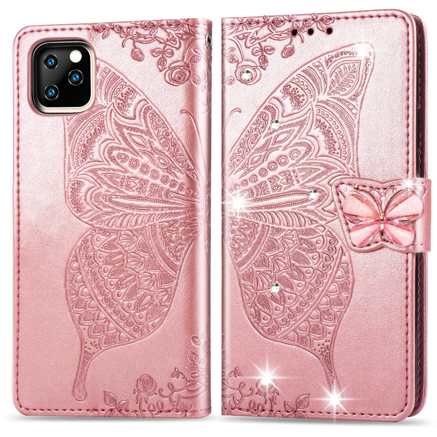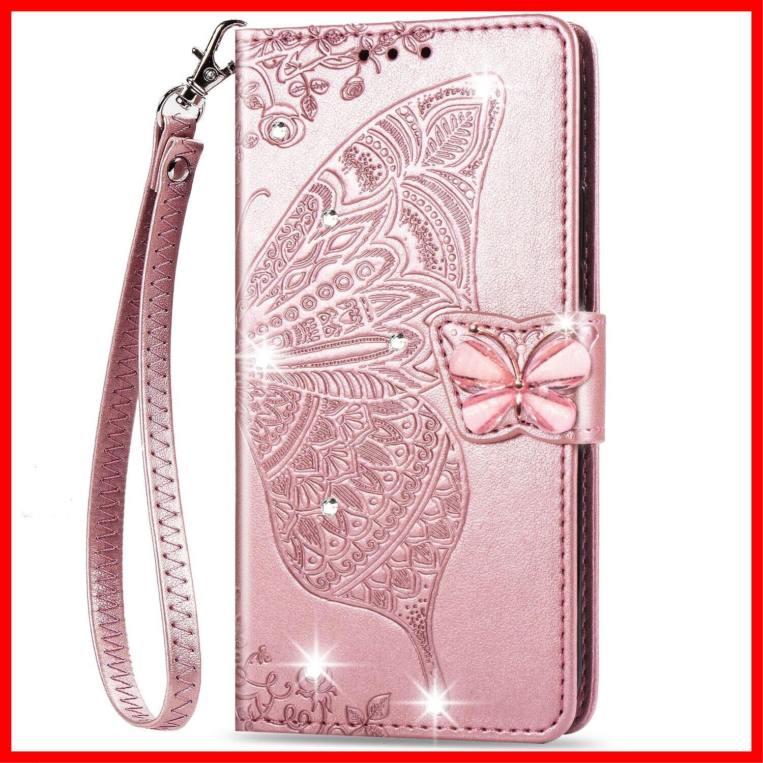 iPhone 12 / 12 Pro 用 ケース 手帳型 かわいい おしゃれ お花 ハート形 きらきら ラインストーン 蝶々 デザイン カード 収納 ストラップ 付き 耐衝撃 アィフォン 12 / 12Pro スマホケース ハンドメイド 女性 優雅 純色 手帳ケース PUレザー 携帯カバー (ローズゴールド)