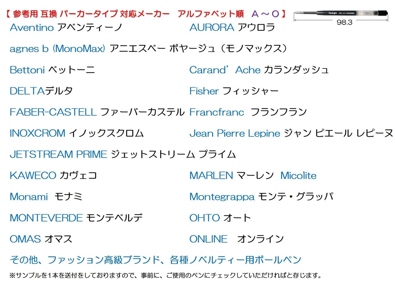 ✒金属製 パーカータイプのゲルインク 開始しました。互換性は樹脂製より寸法を改良して、さらに近づきました。規格はイギリスのブランドであるParkerから始まったため「パーカータイプ」とも呼ばれ、多くの海外ブランドで採用されている「G2型」のリフィルで、大容量リフィルとしては最も互換性の高い規格です。