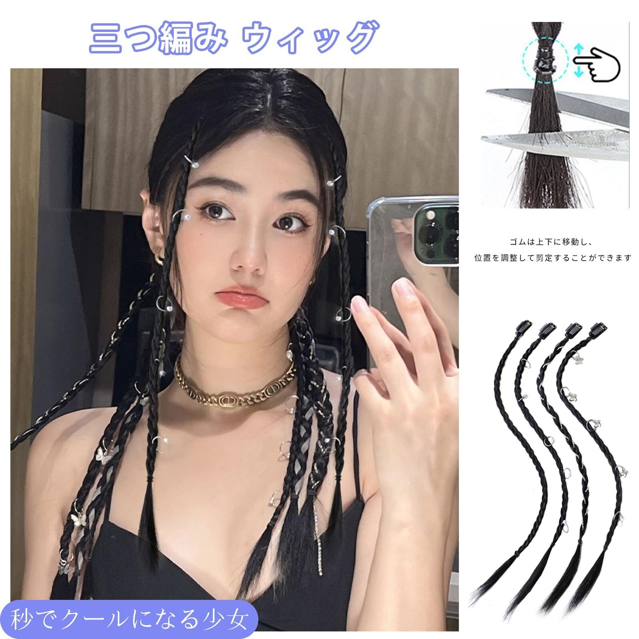 三つ編み ウィッグ【4個セット】ヘアエクステ 三つ編み エクステ ウィッグ 三つ編み エクステ 付け毛 可愛い キラ キラ 髪飾り 編み込み エクステンション 簡単装着 仮装 文化祭 誕生日 発表会 パーティー 舞台用 子供 レディース