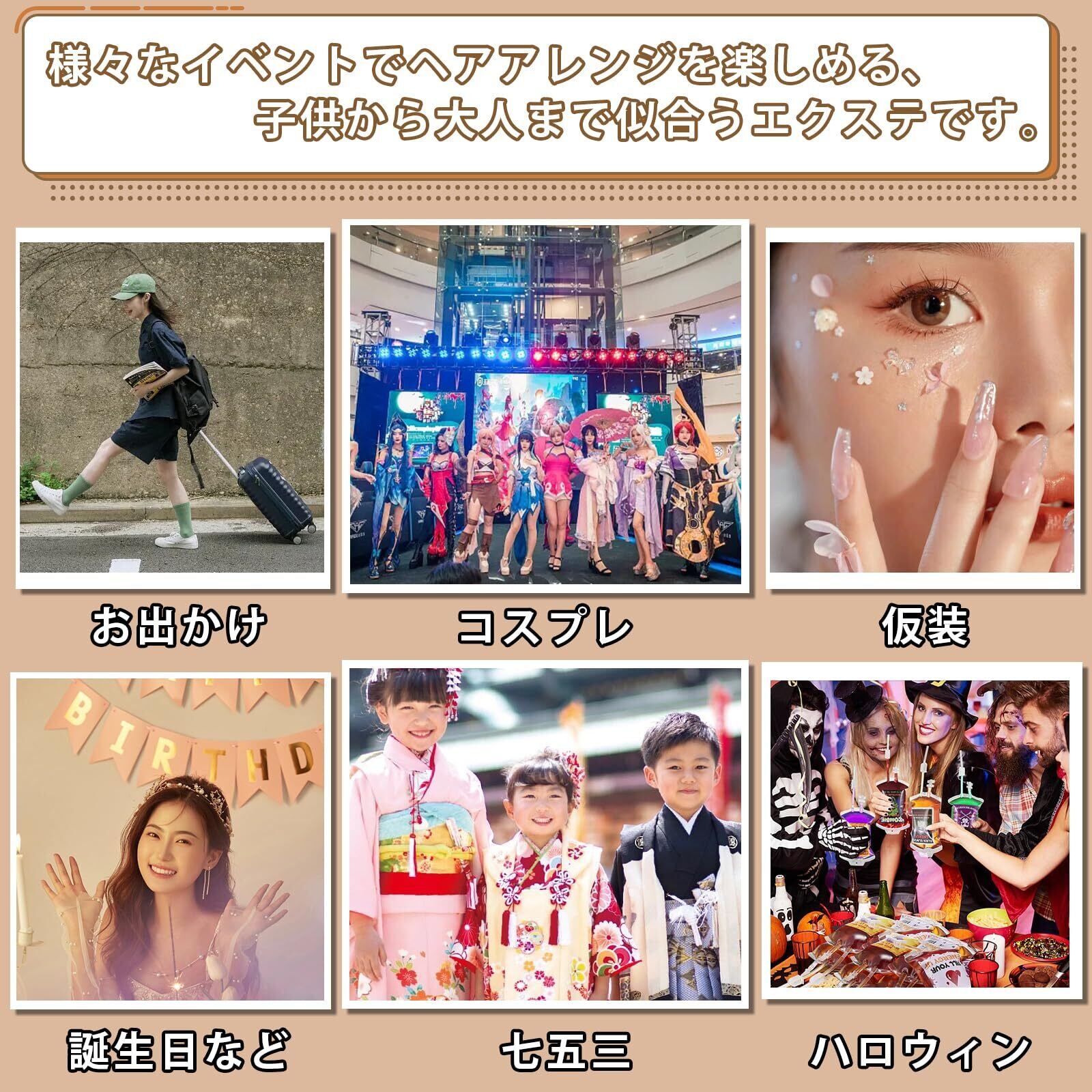 【幅広い用途】様々なイベントでヘアアレンジを楽しめる、子供から大人まで似合うエクステです。普段使いや、お出かけ、撮影、ダンス、誕生日、発表会、仮装、七五三、文化祭、イベント、ハロウィン、コスプレ、パーティー、誕生日など、ダンス、さまざまなシーンで活躍します。