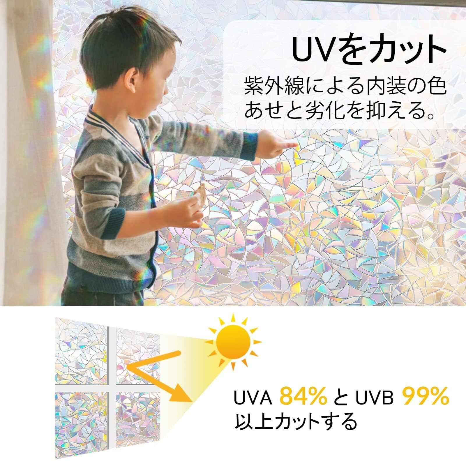 目隠し・UVカット:日差しやライトの光などのあたる所にはれば、虹色になったりし、可視光を反射して目隠しになったりします。光が強ければ強いほどカラフルになります。また、紫外線UVA 84%・UVB99% 以上カットし、際の家具や床材の劣化、肌にもたらす損害を大幅軽減します。要注意:設置の成功は使い方次第です。商品の説明ページの使い方と注意事項を丁寧にお読みください。