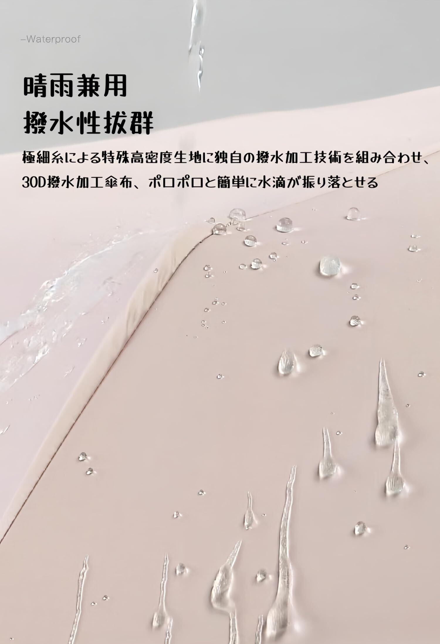 【210T高密度撥水傘布&錆が発生しにくい】210T高密度撥水傘布を使用したため、雨が傘布に接触すると丸い水滴になって滑り落ちます。また、傘骨はアルミ製ですので、一般的なおりたたみ傘より錆が発生しにくい、雨の多い梅雨時期にもラクラク使用できます。さらに、裏面のブッラクコーデングは優れた撥水性があり、雨の浸入を防止できます。春・夏・秋・冬オールシーズンで大活躍の晴雨兼用傘です!