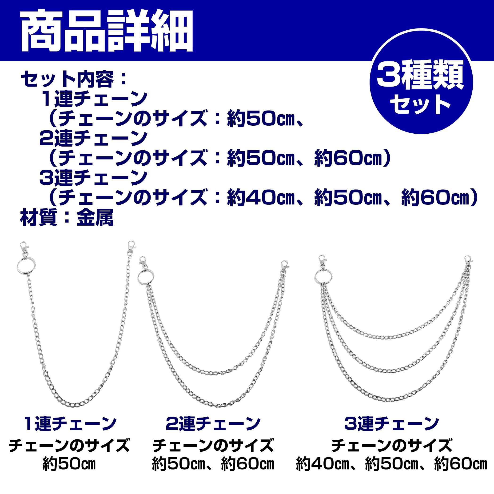 セット内容:1連チェーン(チェーンのサイズ:約50cm)、2連チェーン(チェーンのサイズ:約50cm、約60cm)、3連チェーン(チェーンのサイズ:約40cm、約50cm、約60cm) 材質:金属 ※モニターの環境等により、色の見え方に若干差が生じる場合がございます。
