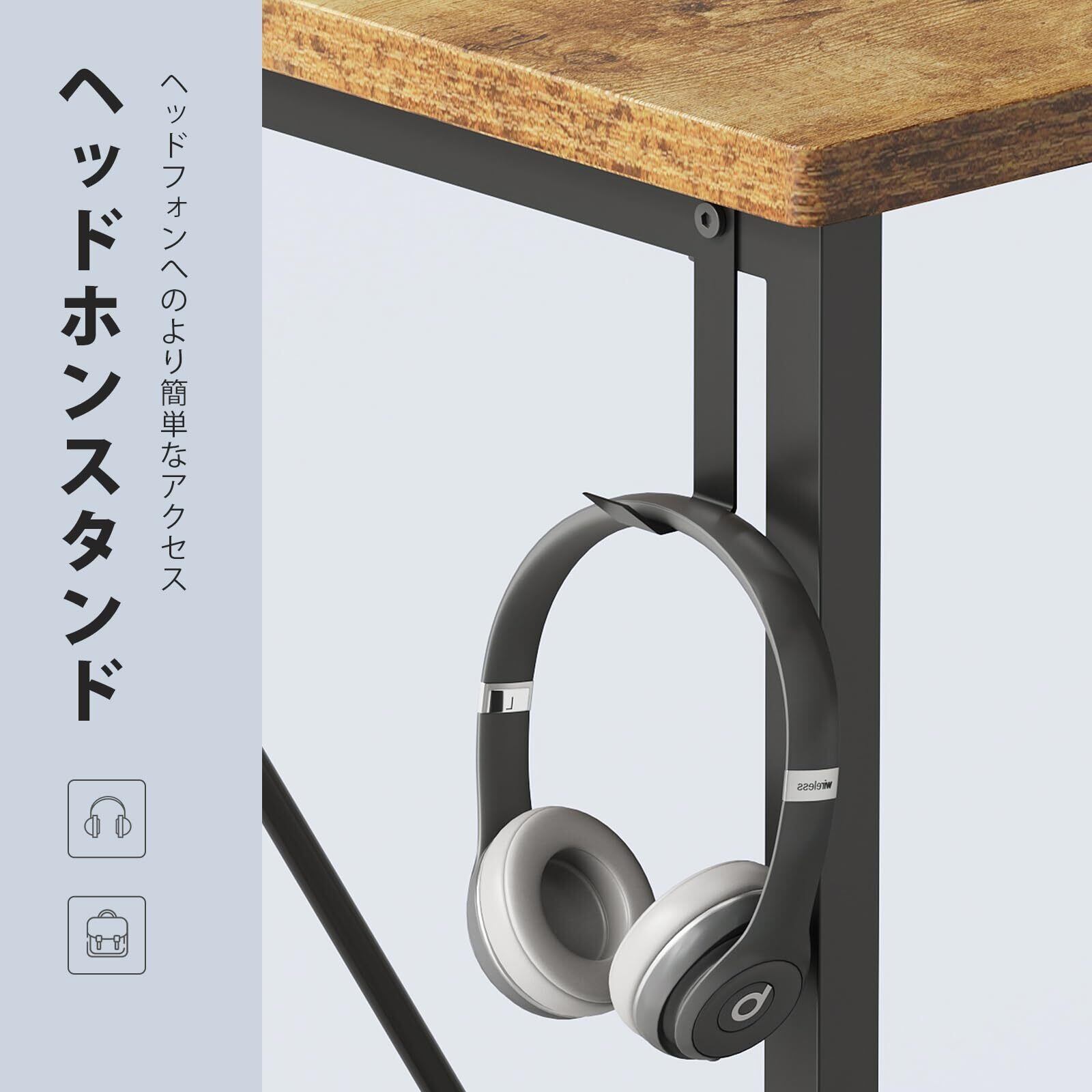 【大きな作業台と収納スペース】机の上は大きいので,パソコンと周辺機器を並べて置くことができ、手元がゆったり使える広さがあります。デスクは丈夫な収納袋とフックが付いておりますので、書類、カバン、ヘッドフォンなどの収納がとても便利になり、天板がすっきり片付けられます。