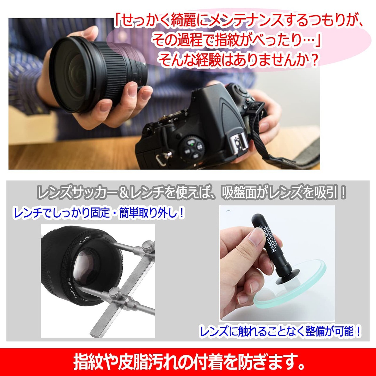 「せっかく綺麗にメンテナンスするつもりが、その過程で指紋がべったり…」そんな経験はありませんか?レンズサッカー&レンチを使えば、吸盤面がレンズを吸引!レンチでしっかり固定・簡単取り外し!レンズに触れることなく整備が可能!指紋や皮脂汚れの付着を防ぎます。
