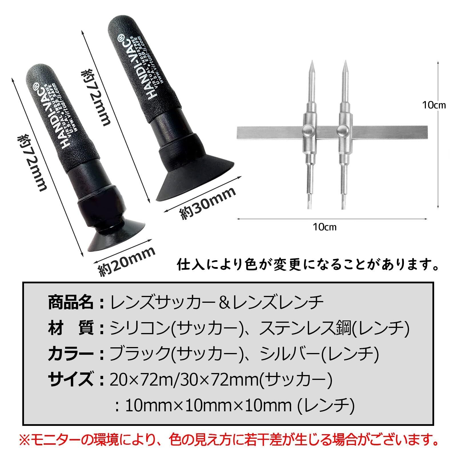※取扱説明書は付属しておりません。【商品内容】レンズサッカー(20mm/30mm)、レンズレンチ【サイズ】レンズサッカー:20mm72mm/30mm×72mm レンズレンチ:10mm×10mm×10mm【素材】レンズサッカー:シリコン レンズレンチ:ステンレス ※モニターの環境により、色の見え方に若干差が生じる場合がございます。