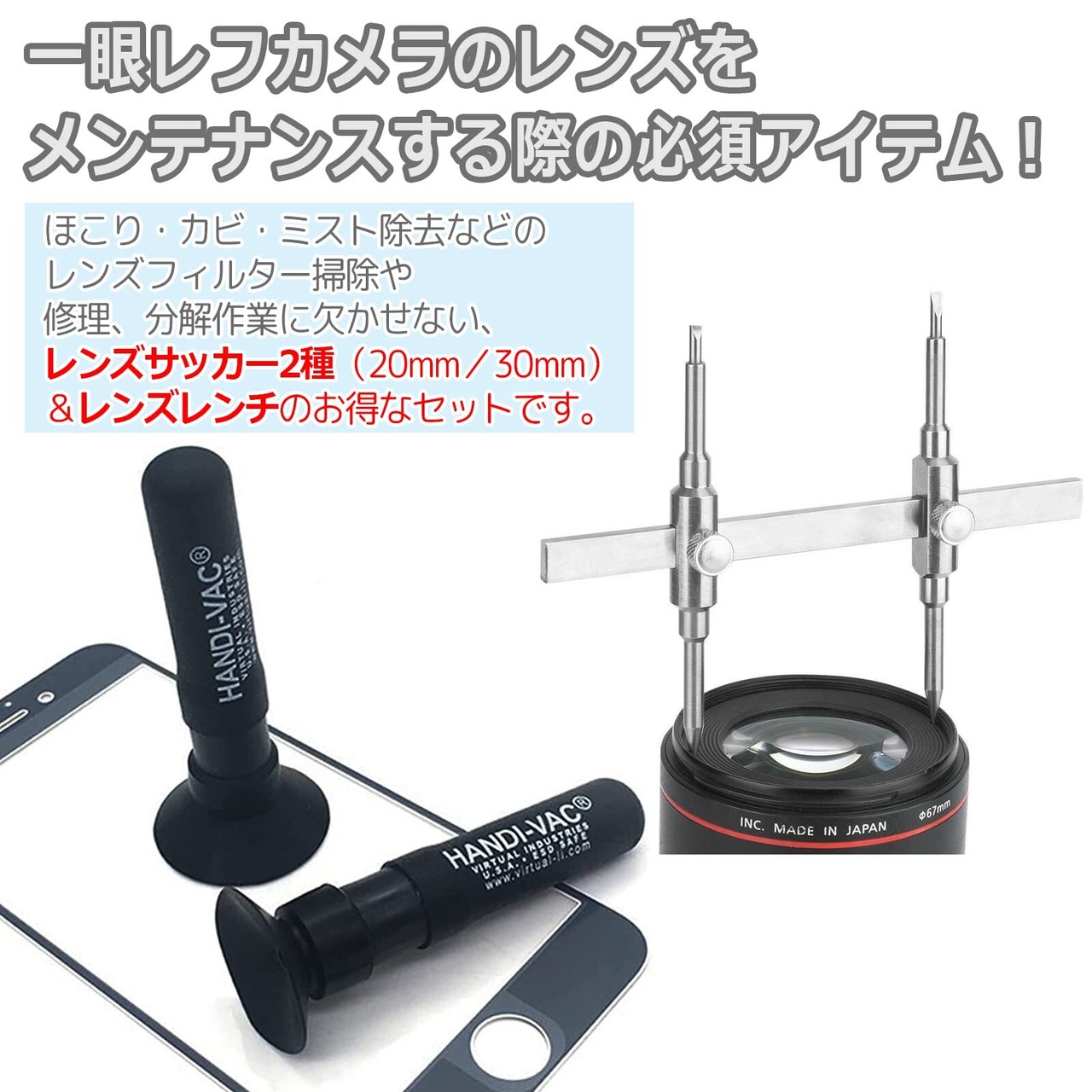 一眼レフカメラのレンズをメンテナンスする際の必須アイテム!ほこり・カビ・ミスト除去などのレンズフィルター掃除や修理、分解作業に欠かせない、レンズサッカー2種(20mm/30mm)&レンズレンチのお得なセットです。
