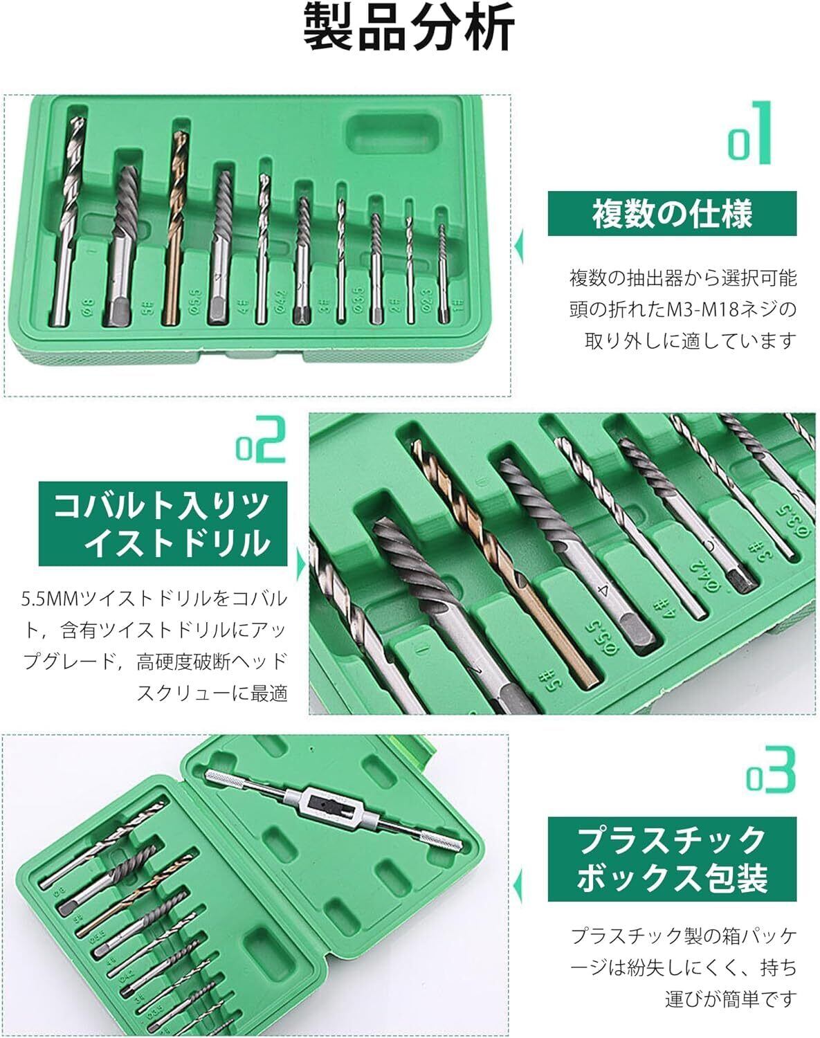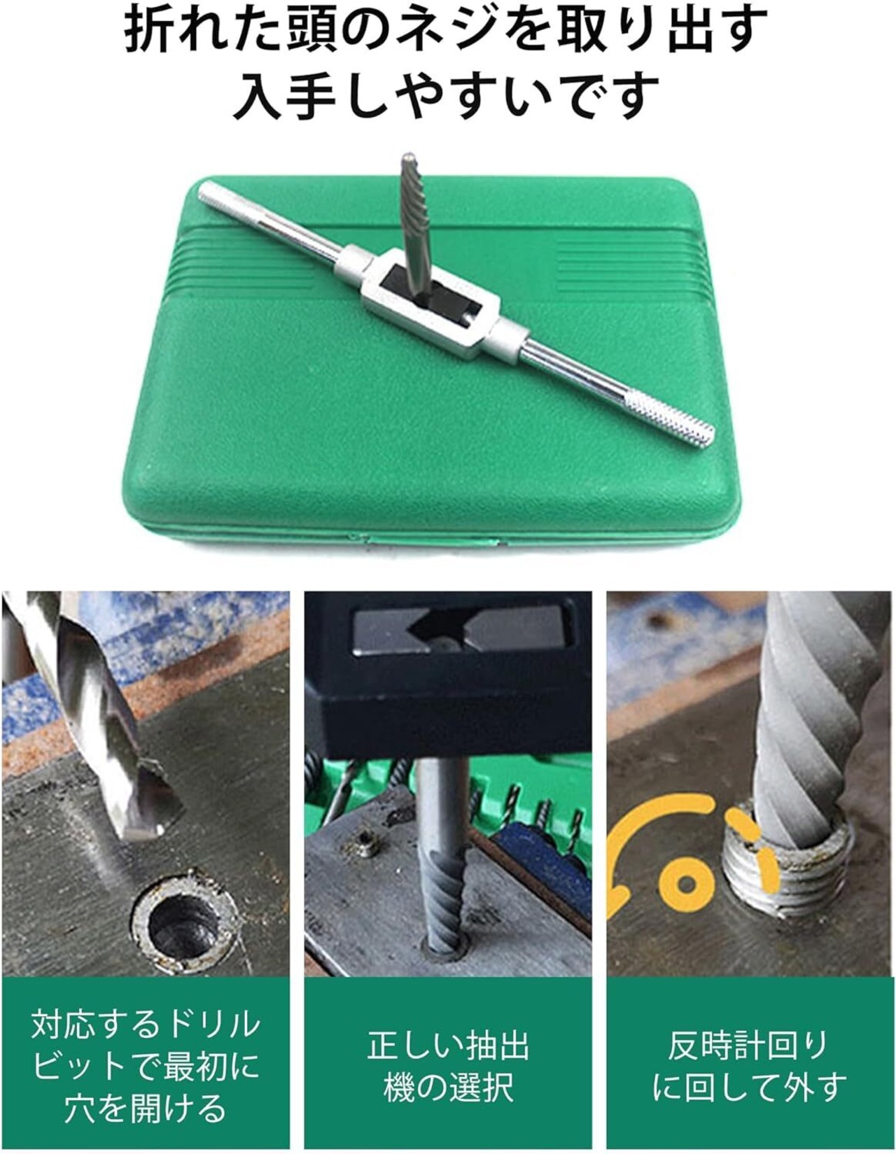 【材質】付属のドリルはHSS(高速度工具鋼)です。高速回転でご使用いただけます。粗い左ねじ高品質工具鋼鍛造、強度と耐久性高品質のドリルビット高速度鋼鍛造、各種仕様しっかりとクランプされたエキストラクター折れたネジの取り外しが容易