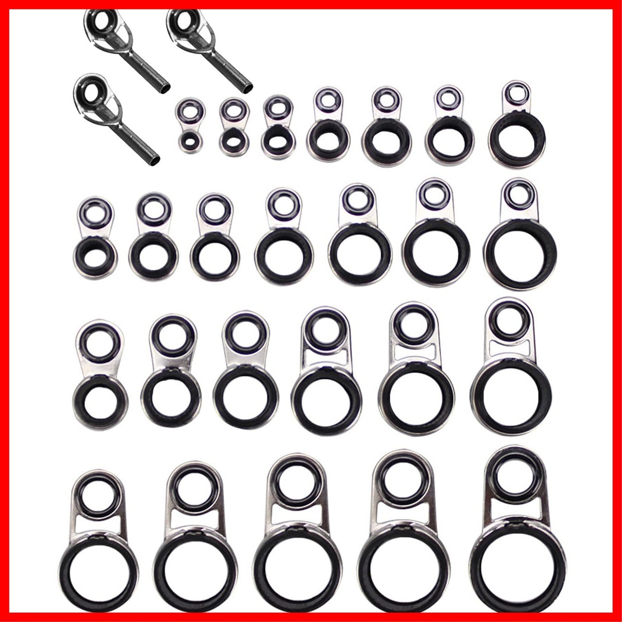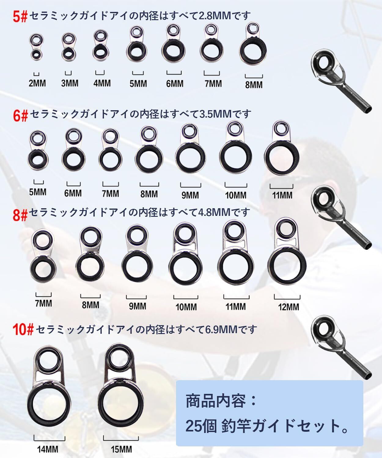 さまざまなモデルの製品が25個入りで、ラインリングアイの直径サイズ:3.0mm(取付穴の直径:2/3/4/5/6/7 / 8mm);4.0mm(取付穴の直径:5/6/7/8/9/10 / 11mm/12mm/14mm/15mm)トップリングガイドアイを3個プレゼント。磯遠投竿、磯上物竿、振出、船小物、メバルなどルアーフィッシングのライトゲームなどに使われています。さまざまなリング径の要求を満たし、さまざまなタイプのロッドの修理が可能です。