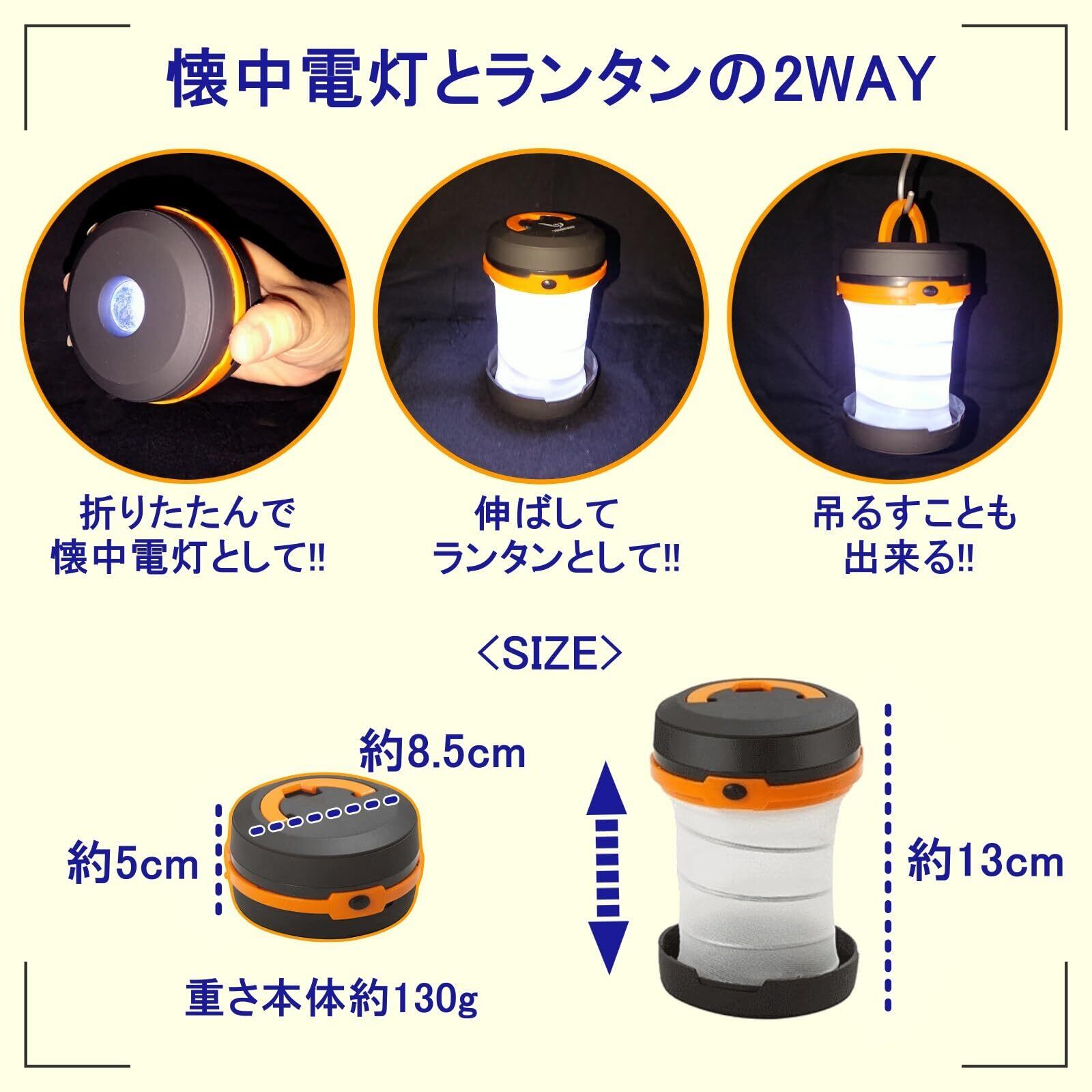 突然の停電時や災害時に大活躍!!ランタンと懐中電灯の2通りで使うことが出来る、乾電池式の携帯性、収納性抜群の折り畳み式ランタンです。折り畳み式ランタンは2WAY設計。折り畳んでいるときは、懐中電灯としてもしっかり使える!コンパクトのボディなのに意外と明るく、遠くまで照らすことが出来ます。本体を伸ばしての使用時は全体をやさしく照らす、据え置き型のランタンとして便利に使えます。吊るして使用もOK!