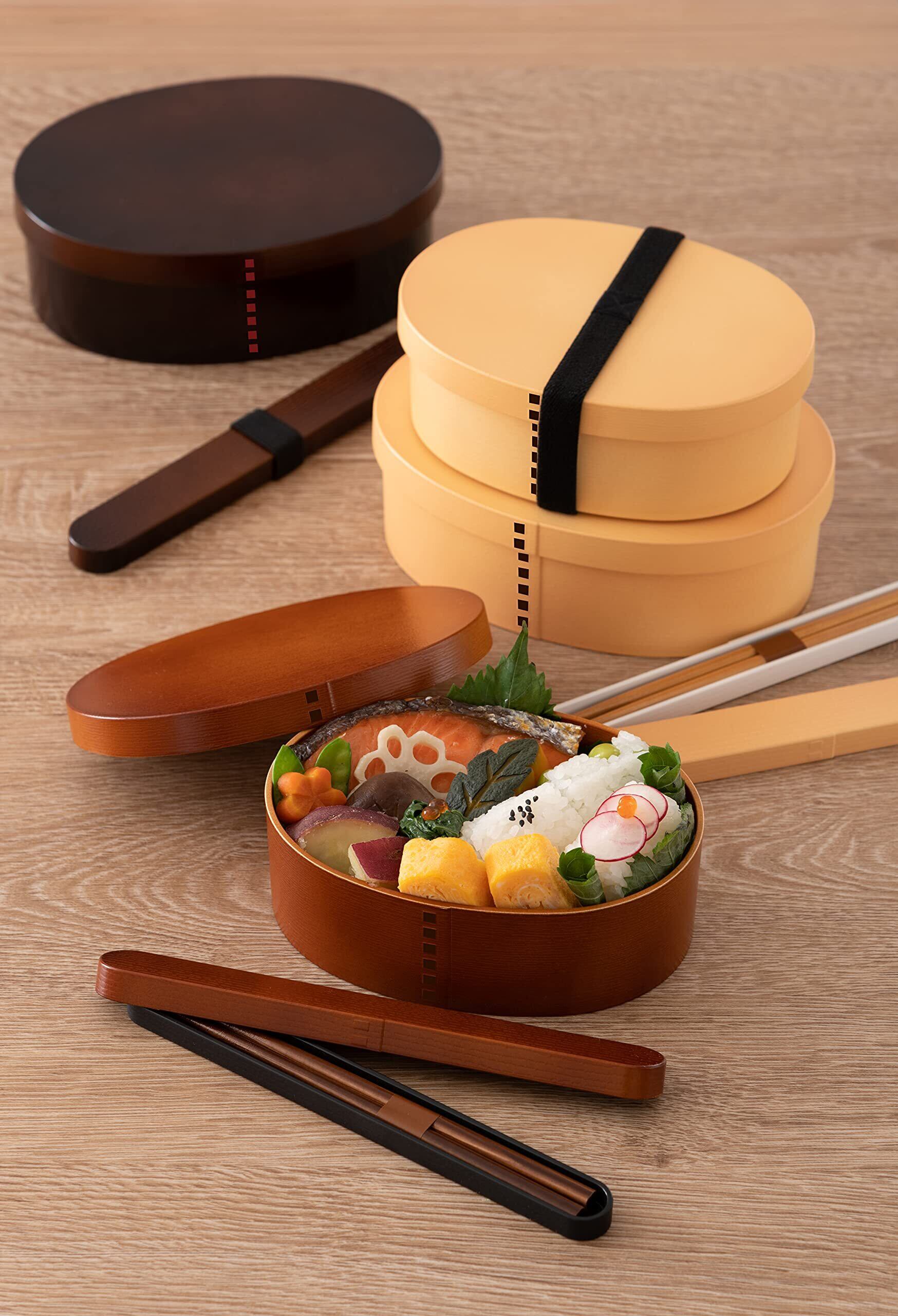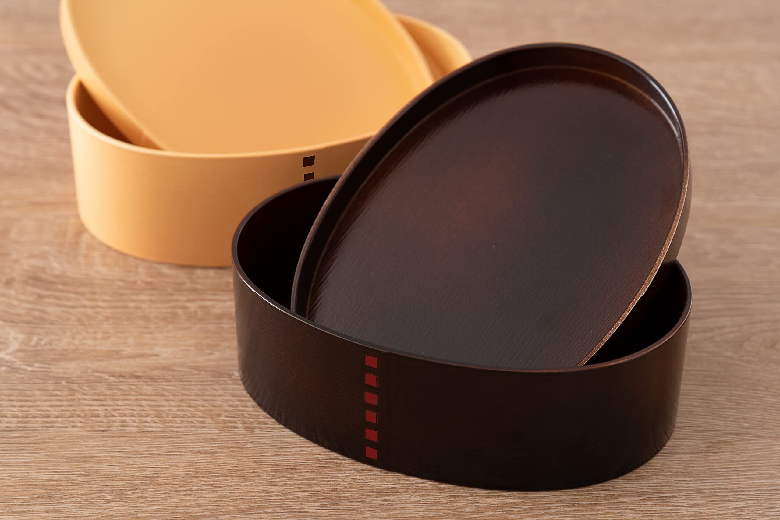 木製曲げわっぱのような質感。抗菌剤入り塗料を使用し内面を塗装した塗り弁当箱。電子レンジ、食器洗い乾燥機対応