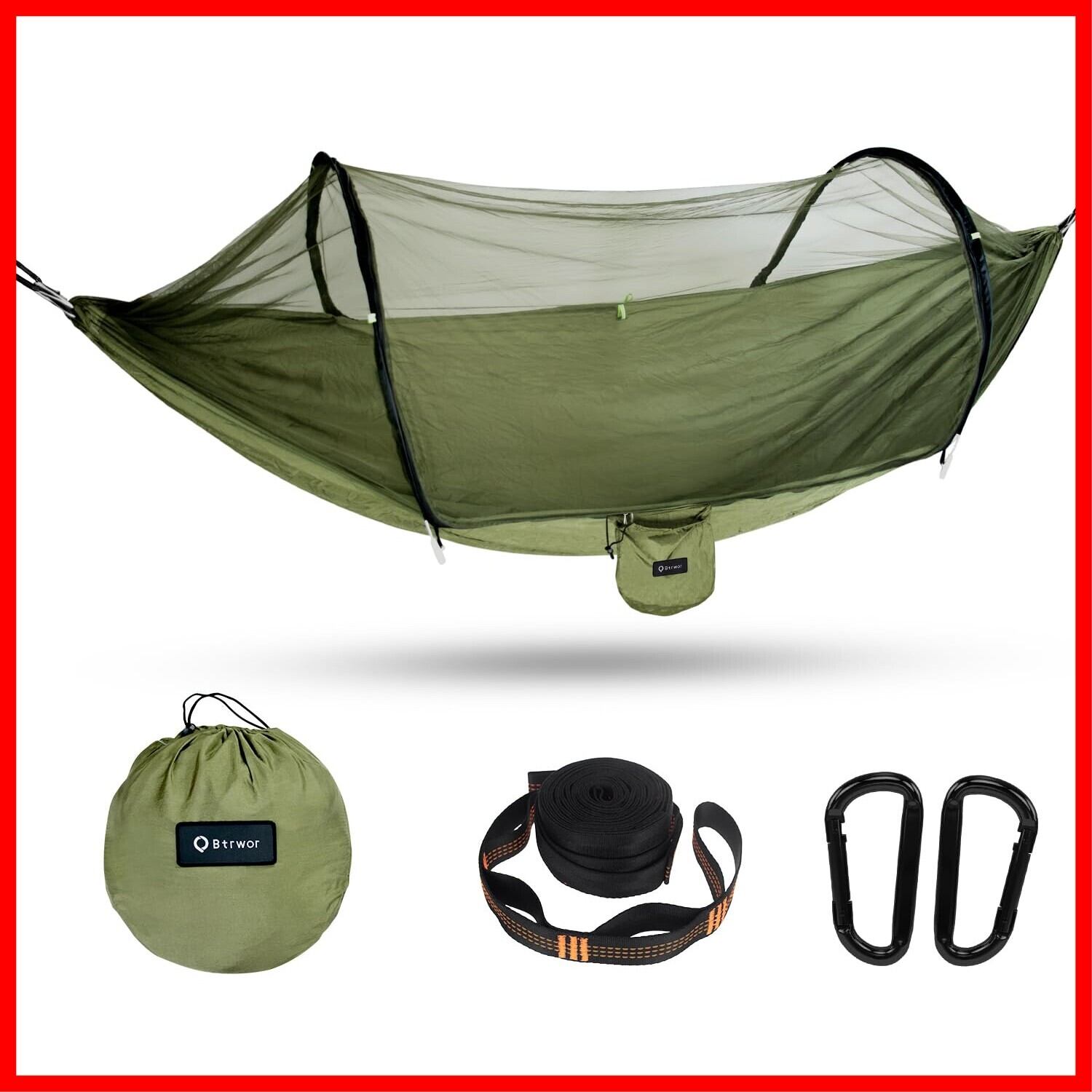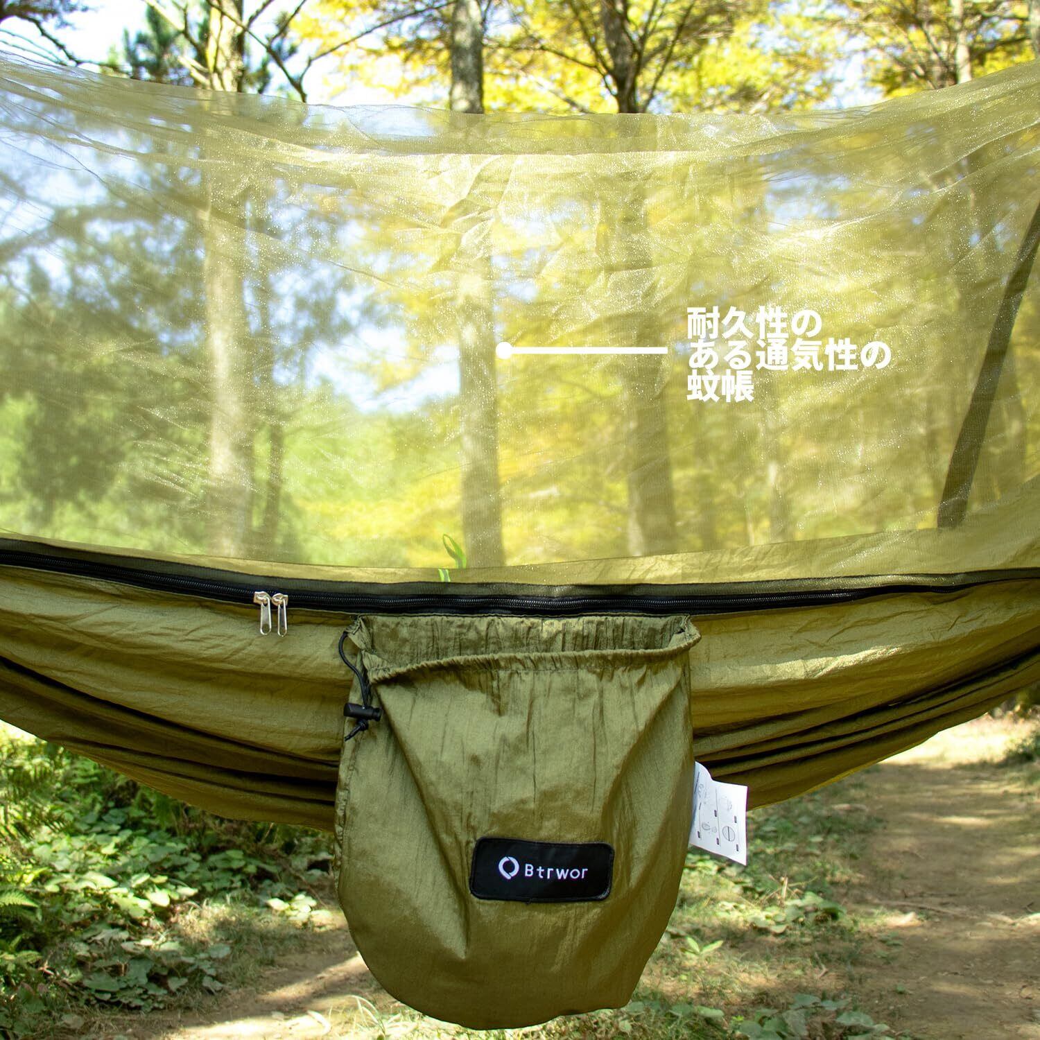 ハンモック モスキートネット付き 軽量 ポータブル ナイロン 260×140cm 耐荷重 300kg 自動蚊帳設定 キャンプ、インドア、アウトドアに適しています (アーミーグリーン)