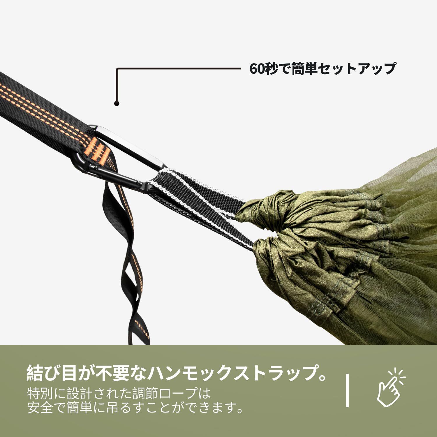ハンモック モスキートネット付き 軽量 ポータブル ナイロン 260×140cm 耐荷重 300kg 自動蚊帳設定 キャンプ、インドア、アウトドアに適しています (アーミーグリーン) | hananoki