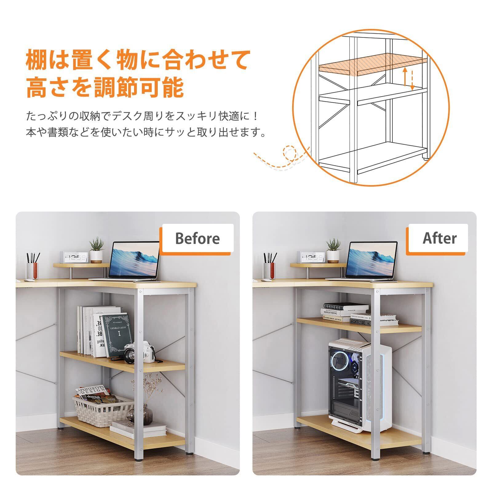 【ラック付きデスク】デスクの足元には一体型のラックが備え、本や書類などを使いたい時にサッと取り出せます。また、L字型のデザインで部屋のコーナーを最大限に活用でき、ご家庭でもオフィスでも、日常の操作に十分なスペースを確保できます。