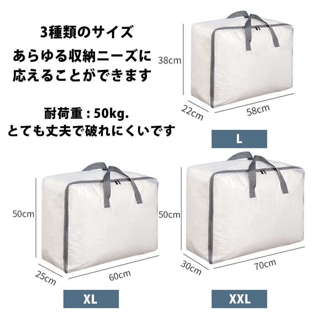 【機能性】強靭な構造を持つこの収納袋は、強荷重50KGにも耐えられるアイテムで、安定した収納スペースを提供します。持ち手とファスナーが付いているため、持ち運びも楽々!透明な素材を使用しているため、中身が見やすく、何を収納しているのか一目で分かります。押入れやクローゼットの空間を有効活用できる設計が嬉しいポイントです。