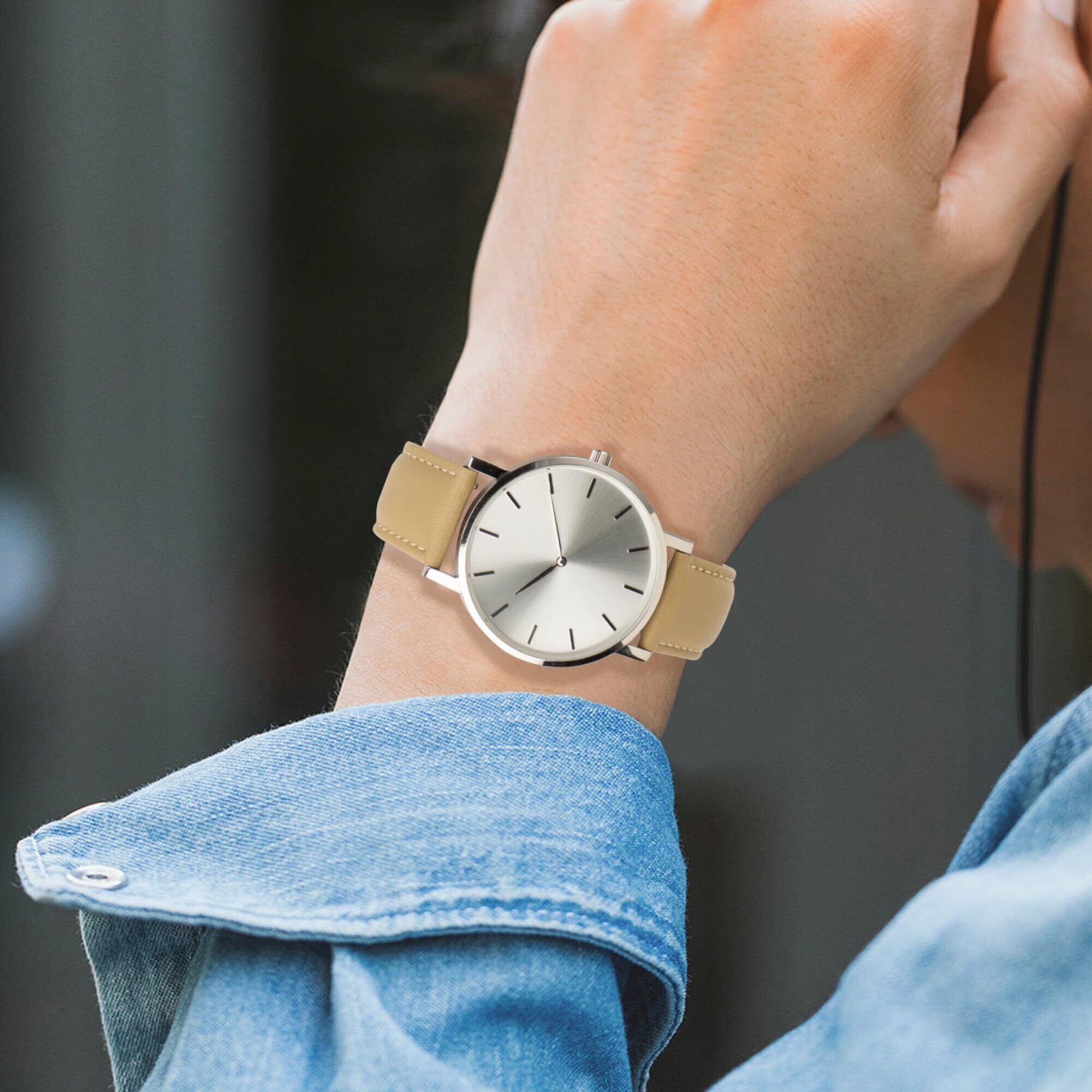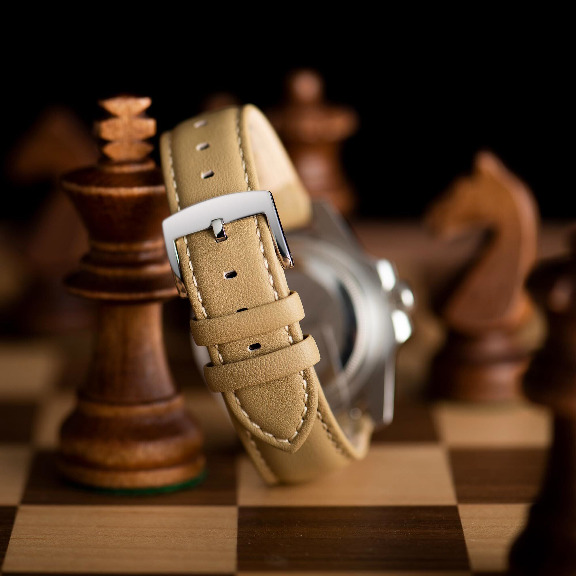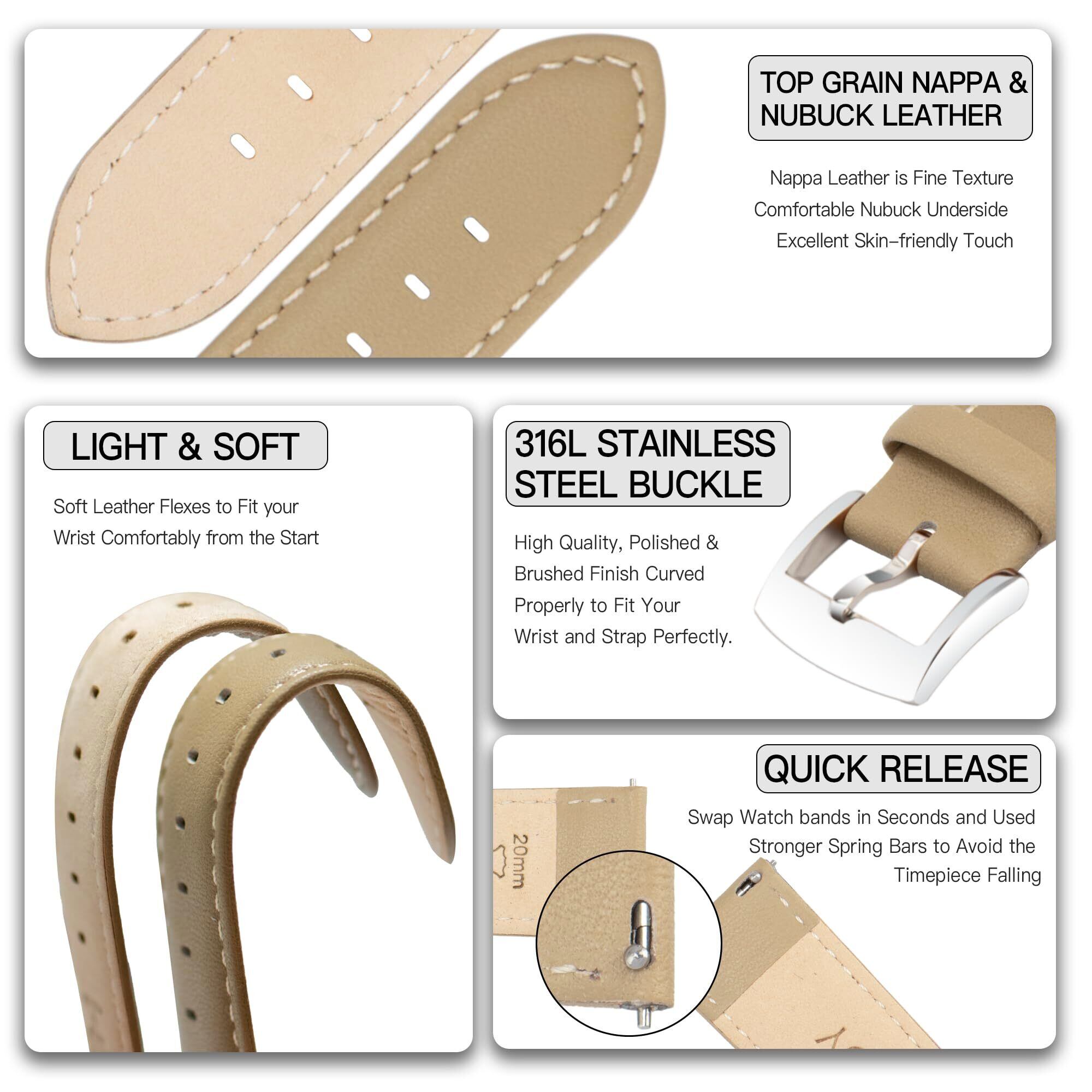 トップグレイン本革とヌバックライニング: 厳選されたトップグレインナッパレザーがレザー時計バンドの最上層に使用され、柔らかく滑らかなレザーで高級感を演出しています。 裏側はコンフォートベージュのヌバックレザーで、時計ストラップの裏地として最適で、肌にぴったりフィットし、滑りを最小限に抑えながら理想的な快適さを提供し、汗による悪臭も防ぎます。