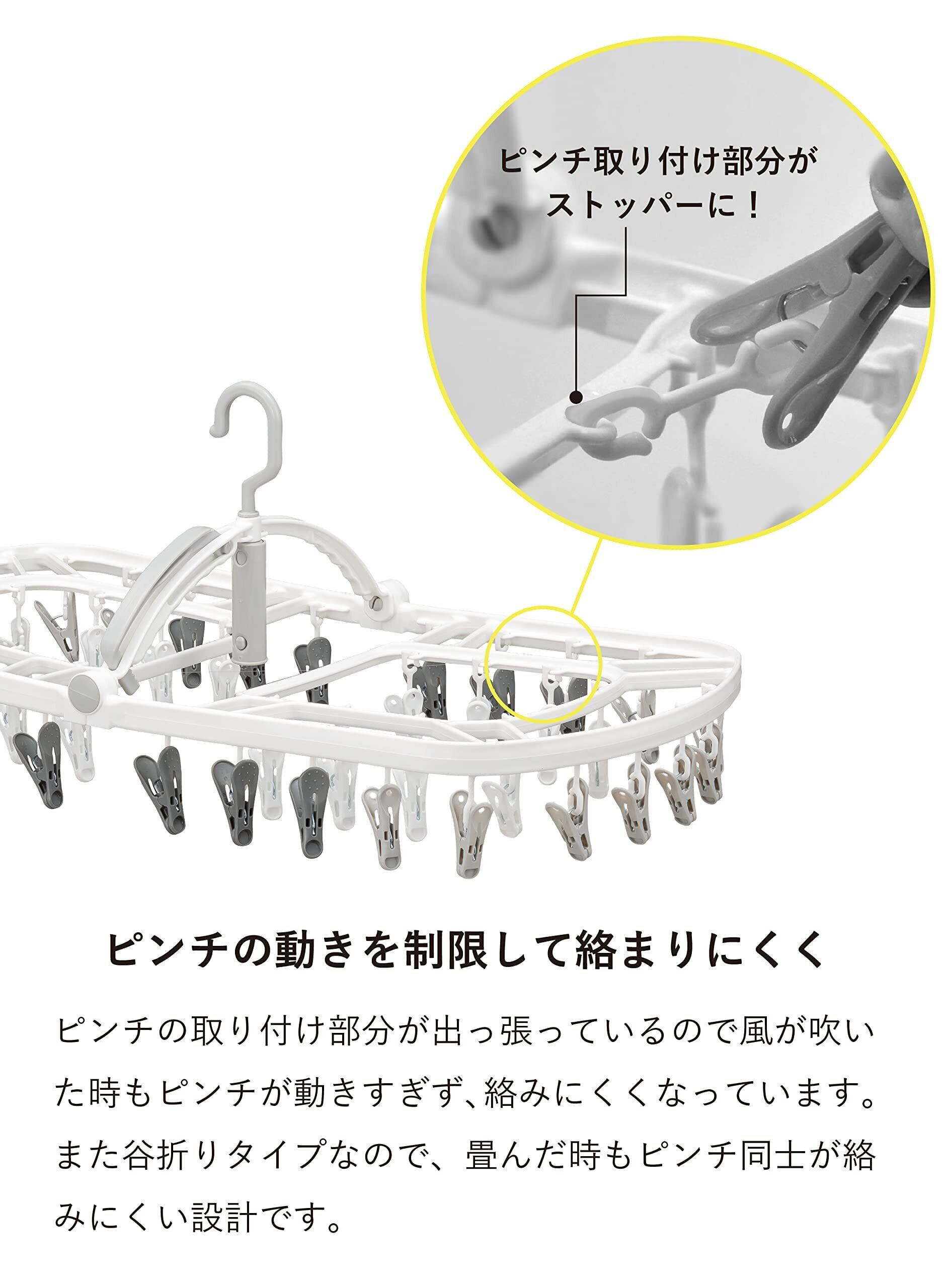 独自の形状で「ピンチが絡まりにくい」ピンチがフレームの上まで回って他のピンチと絡まってしまうことがあります。そこで、ピンチの取り付け部分に突起を付けることにより、その動きを制限しピンチを絡まりにくくしています。