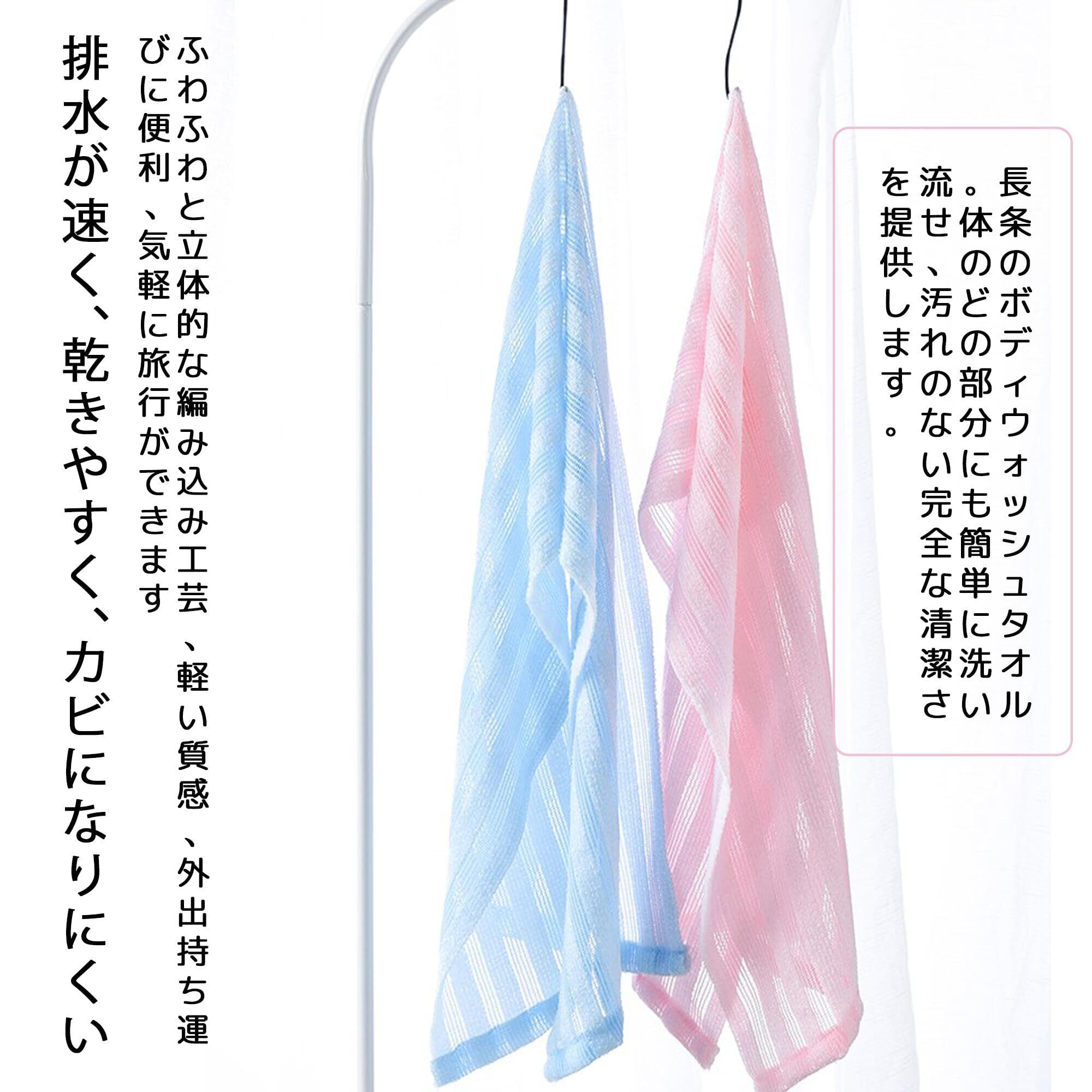 【高品質素材】ボディタオルは柔らかい生地で作られており、滑らかな触感、優しい肌触り、快適な使用感があります。少量のボディーソープでもすぐに泡立ち、体を洗うのが更に簡単になります。