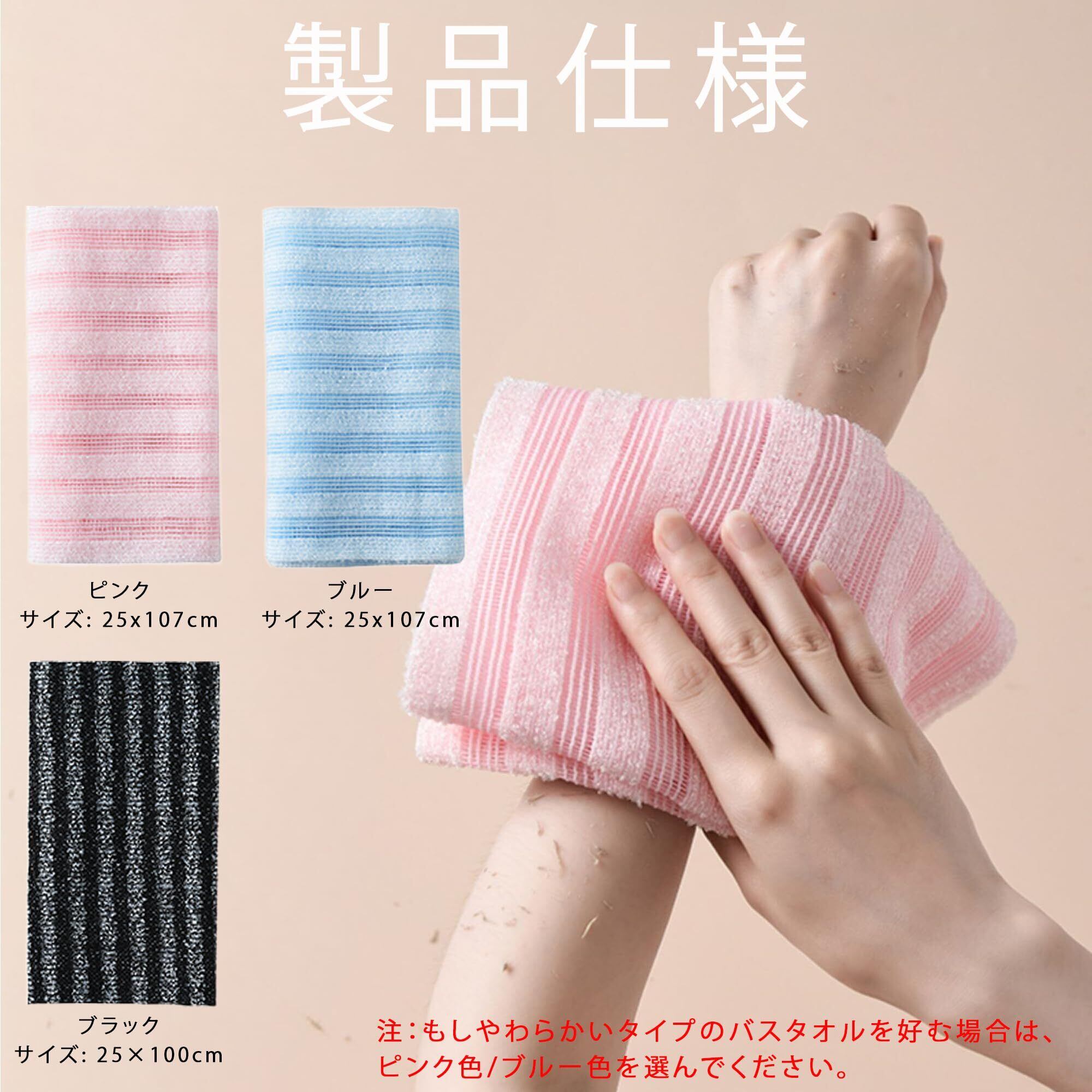 【製品仕様】ボディタオルのサイズは:107*25cm、重さは約50gです。この角質ケア タオルは、黒白ストライプ、ブルー白ストライプ、ピンク白ストライプの三つの色が選べます。バスタオルは十分に長く、背中など手が届きにくい部分を簡単に洗浄することができ、同時に折り畳むことで洗浄がさらに簡単になります。