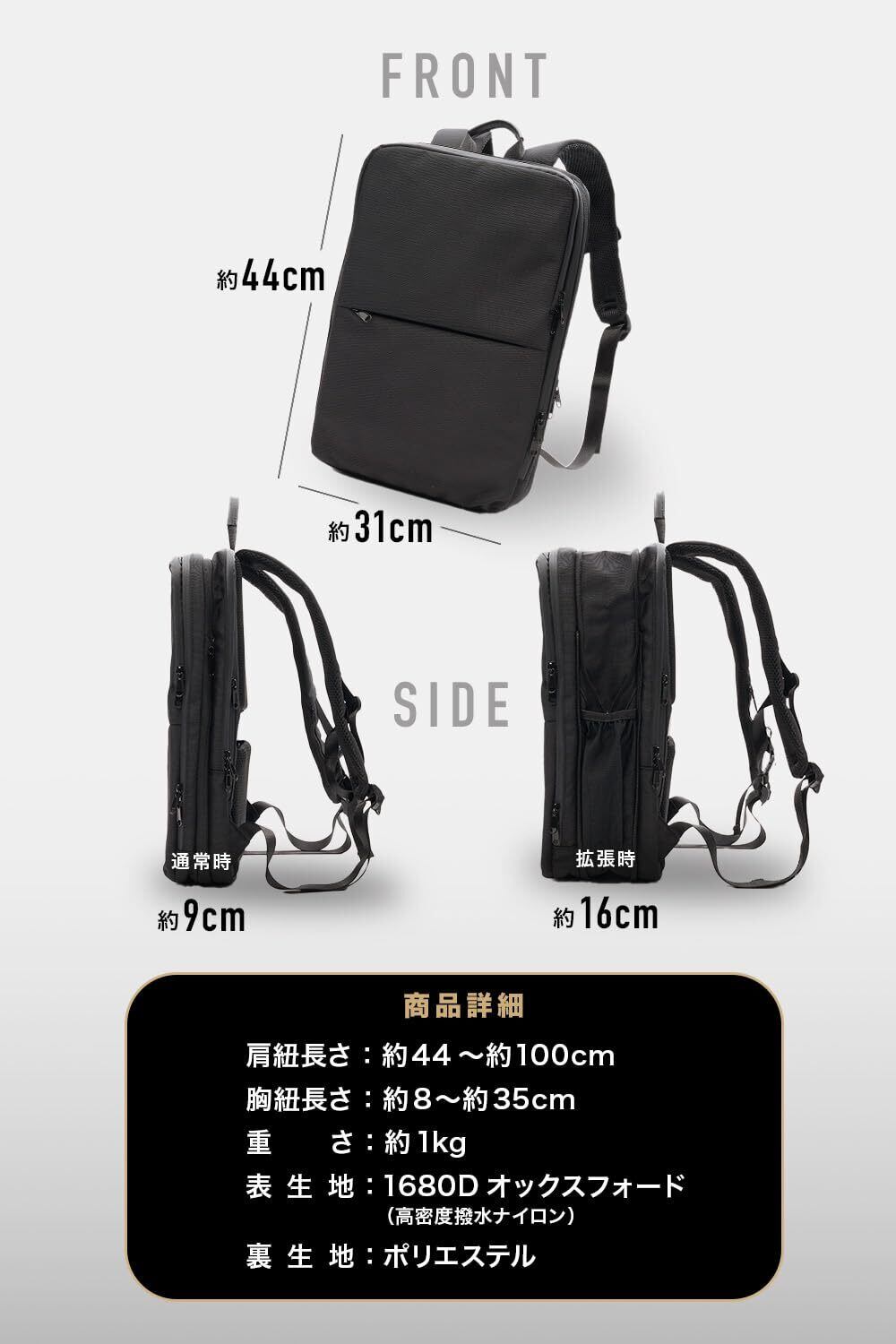 【容量拡張型だから通勤から出張までこれ一つ】 拡張前:約8L (約44×31×9cm)の薄型サイズ。前に背負っても邪魔にならず、電車などの移動や通勤もストレスフリー。 拡張後:約17L(約44×31×16cm)と容量は2倍以上に拡張可能。出張やちょっとした旅行でも大活躍間違いなし。 シンプルデザインなのでビジネスにもプライベートにも使える万能リュックです。
