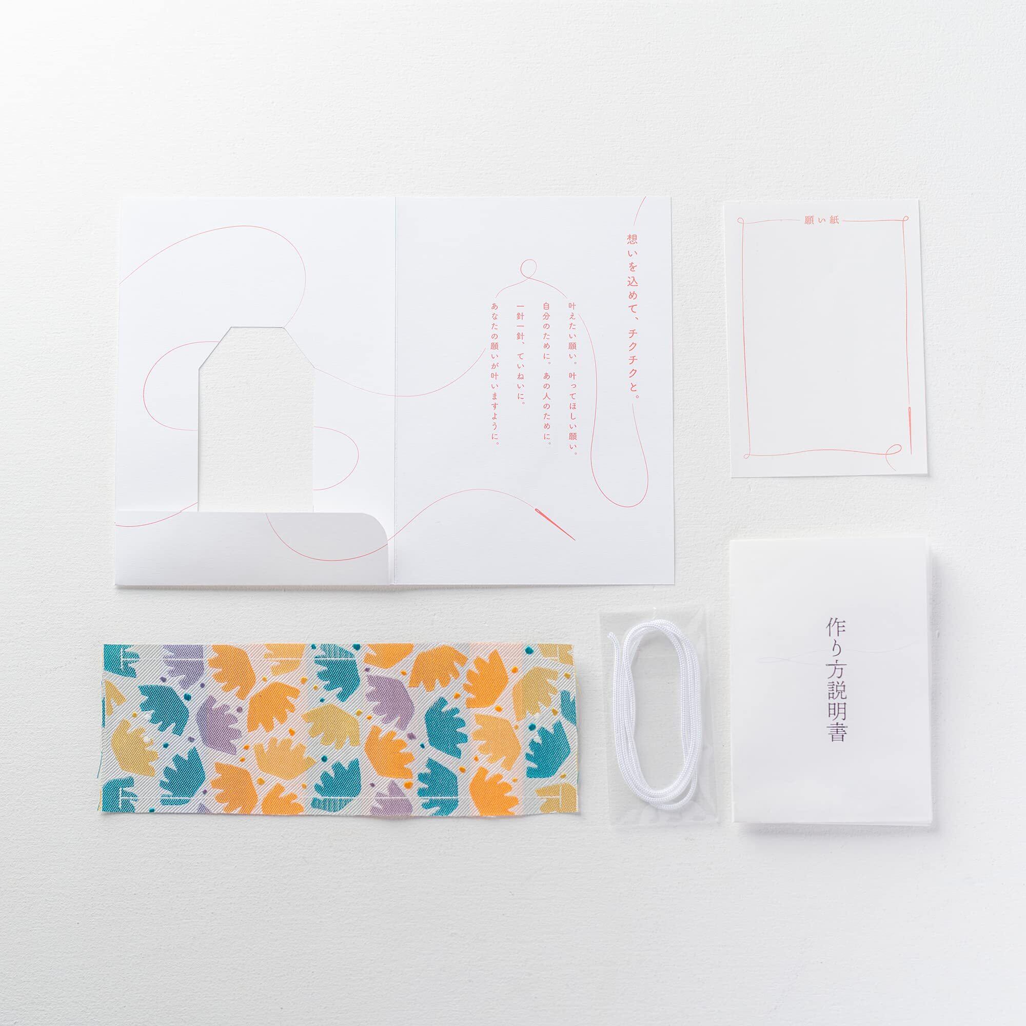 キットに含まれる品:お守り生地、打ち紐用の紐、作り方説明書、願い紙(願い事を書く紙)