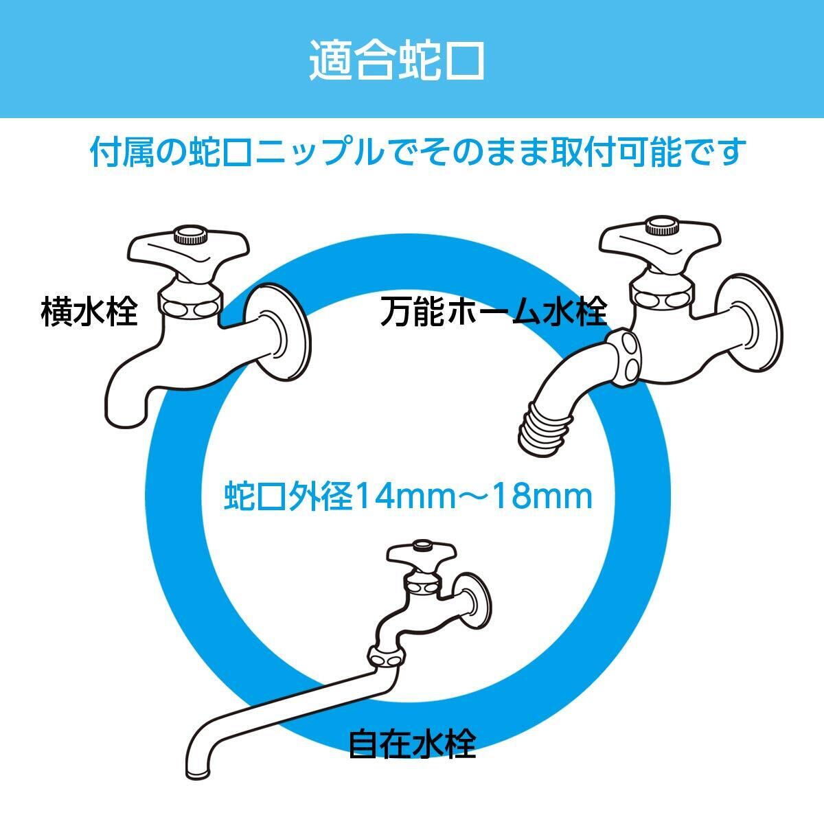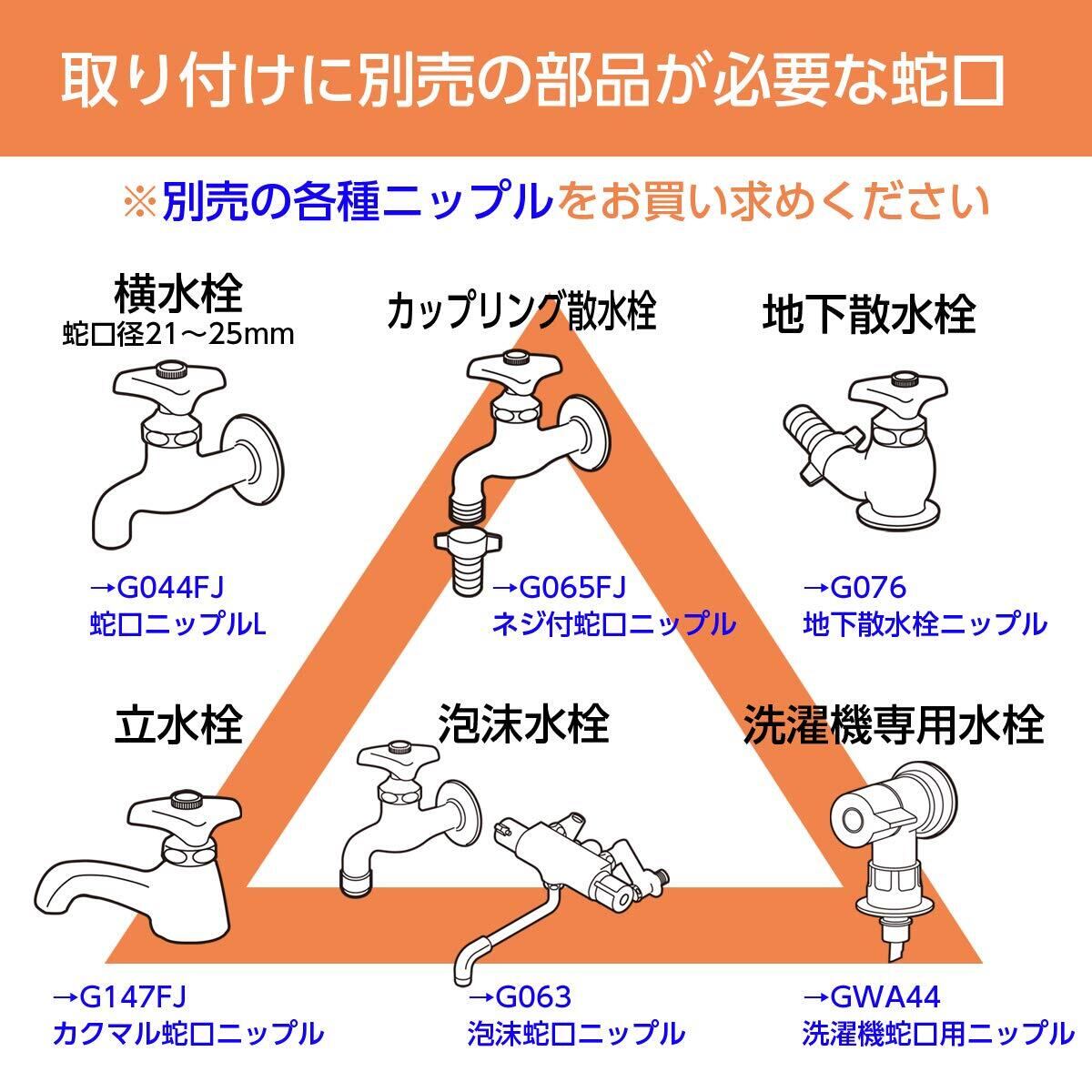 狭い場所での散水や、ベランダでの水やりに便利なハンガータイプのコンパクトリールです。 散水ノズルの水形は7種類です。 横水栓、万能ホーム水栓、自在水栓(蛇口外径14mm~18mm)の 蛇口には付属の蛇口ニップルでそのまま取り付け可能です。