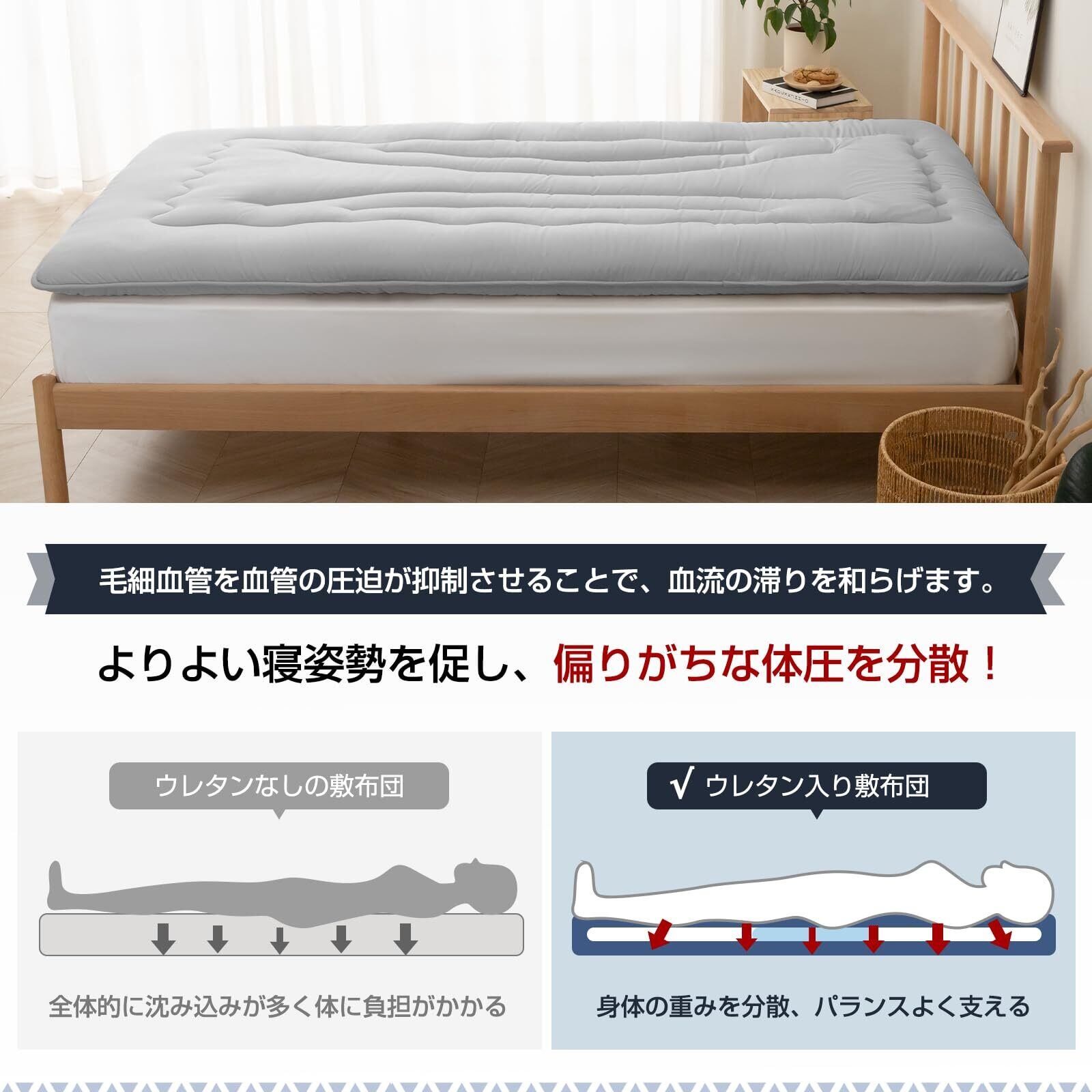 【しっかり体を支える】ウレタン入りの敷き布団で体をしっかり支え、ボリューム感たっぷりの敷布団です。抗菌防臭・防ダニ機能のある中わた、と弾力性のあるウレタンの三層構造が、ふんわりと身体に包み込んで支えます。ウレタンは毛細血管を血管の圧迫が抑制させることで、血流の滞りを和らげます。身体をしっかり支え、快適な眠りに欠かせない自然な寝姿勢に導きます。