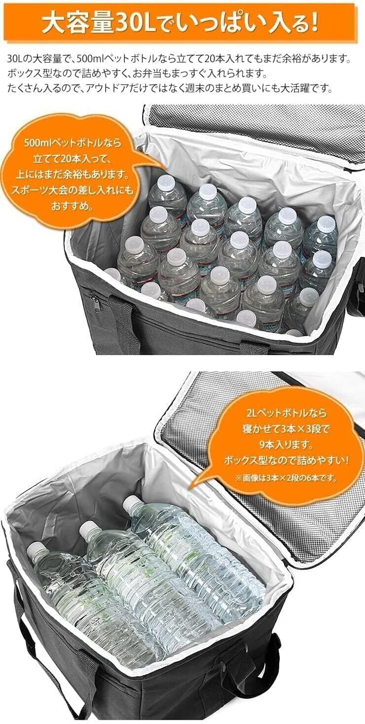 大容量30Lでいっぱい入る!:30Lの大容量で、500mlペットボトルなら立てて20本入れてもまだ余裕があります。 ボックス型なので詰めやすく、お弁当もまっすぐ入れられます。 たくさん入るので、アウトドアだけではなく週末のまとめ買いにも大活躍です。 500mlペットボトルなら立てて20本入って、上にはまだ余裕もあります。 スポーツ大会の差し入れにもおすすめ。 2Lペットボトルなら寝かせて3本×3段で9本入ります。 ボックス型なので詰めやすい!