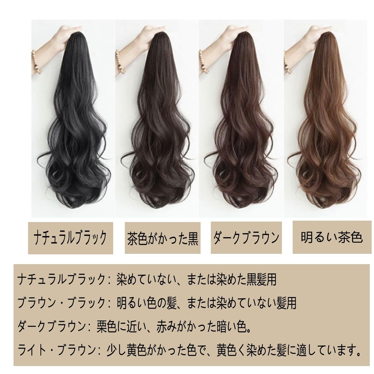 仕様:①長さ:55㎝。※いずれも自然長(カールを伸ばさない状態)での計測。測り方により1cm-3cm誤差が生じる場合がございます。ナチュラルブラック、ブラックブラウン、ダークブラウン、ライトブラウンの4色。4種類の髪色はすべて日常的なコーディネートに特に適しています。
