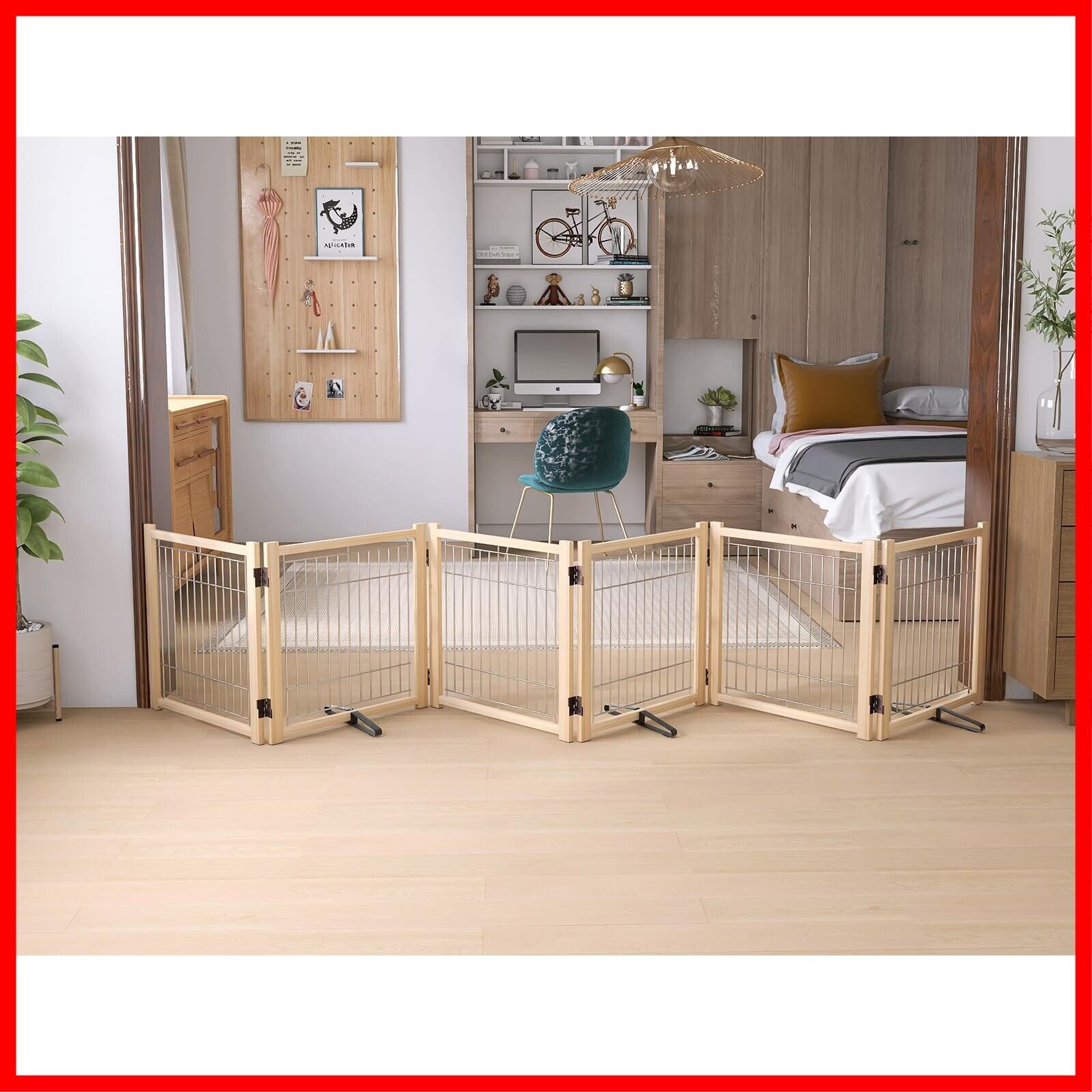 犬 ゲート ペットゲート ペットフェンス 犬用ゲート 天然木色 犬用フェンス 犬 柵 ペット用家具フェンス 安全柵 小型犬 中型犬 脱走防止 ガード 飛び出し防止 多頭飼い ペットガード(高さ58cm、長さ350cm、6つのパネル)